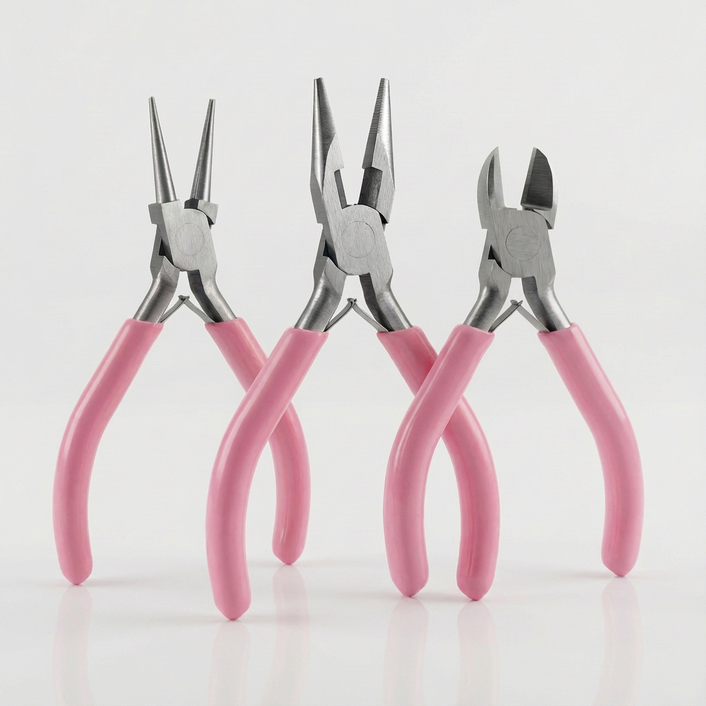 Vielseitiges Zangenset für die Schmuckherstellung aus robustem Kohlenstoffstahl, bestehend aus Rundzange, Seitenschneider und Flachzange. Ideal für Drahtarbeiten, Schmuckdesign, Reparaturen und filigrane Bastelarbeiten. Präzise Verarbeitung für kontrolliertes und sauberes Arbeiten.