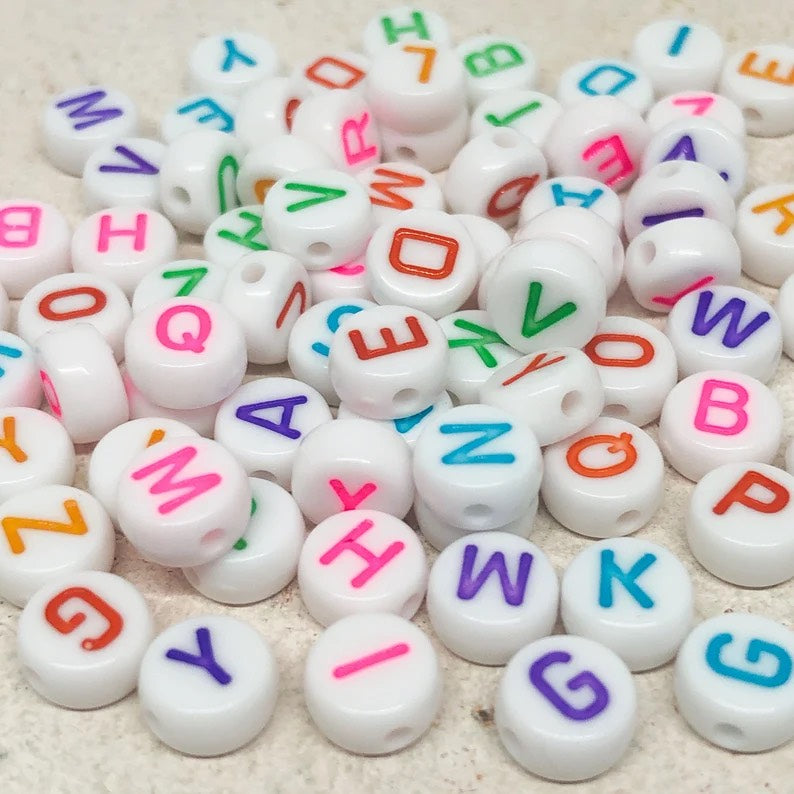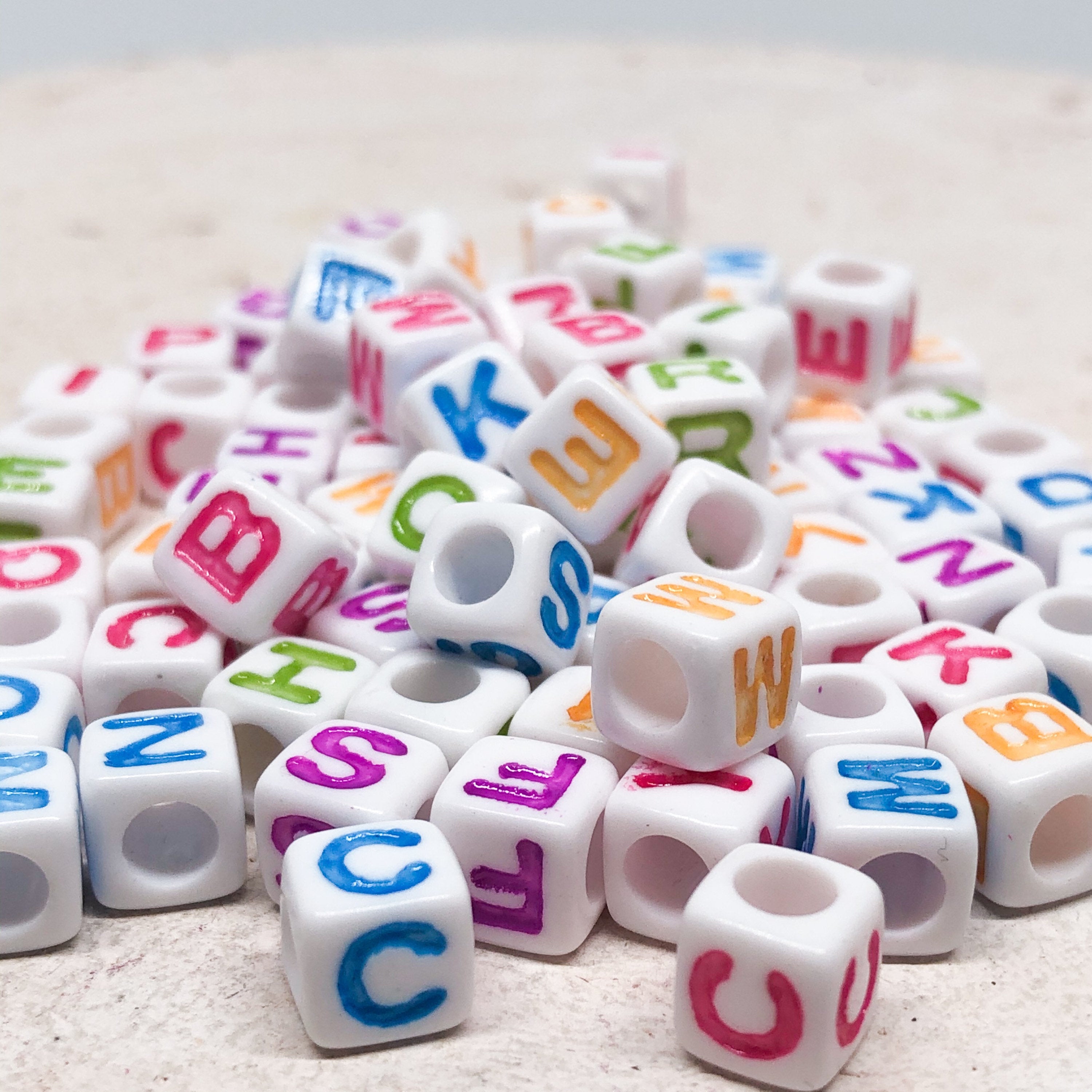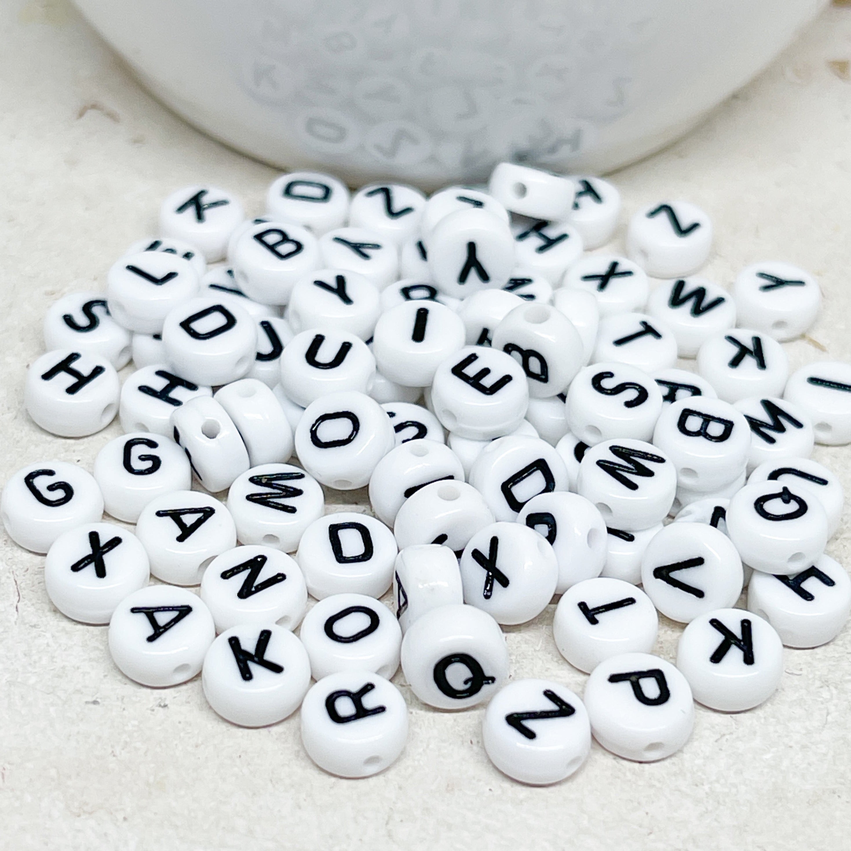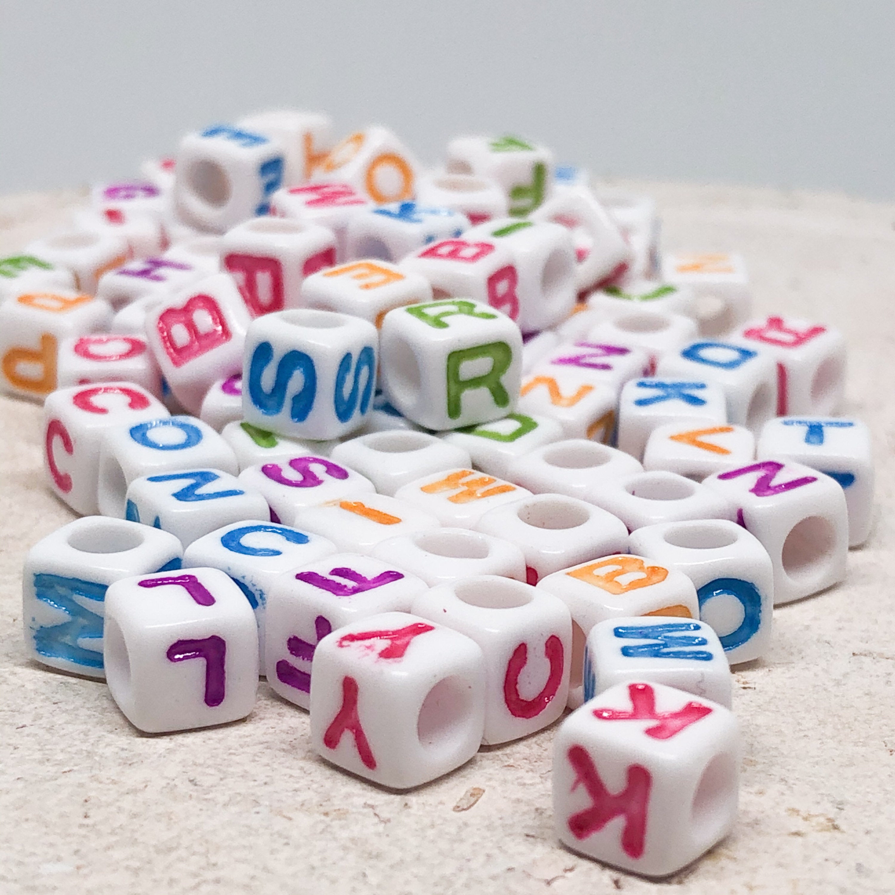 Die leichten Kunststoffperlen sind in verschiedenen Designs erhältlich: klassisch weiß mit schwarzer Schrift, bunte Mixe, goldfarbene Lettern, runde oder eckige Formen – ideal für kreative Botschaften und individuelle Geschenkideen.