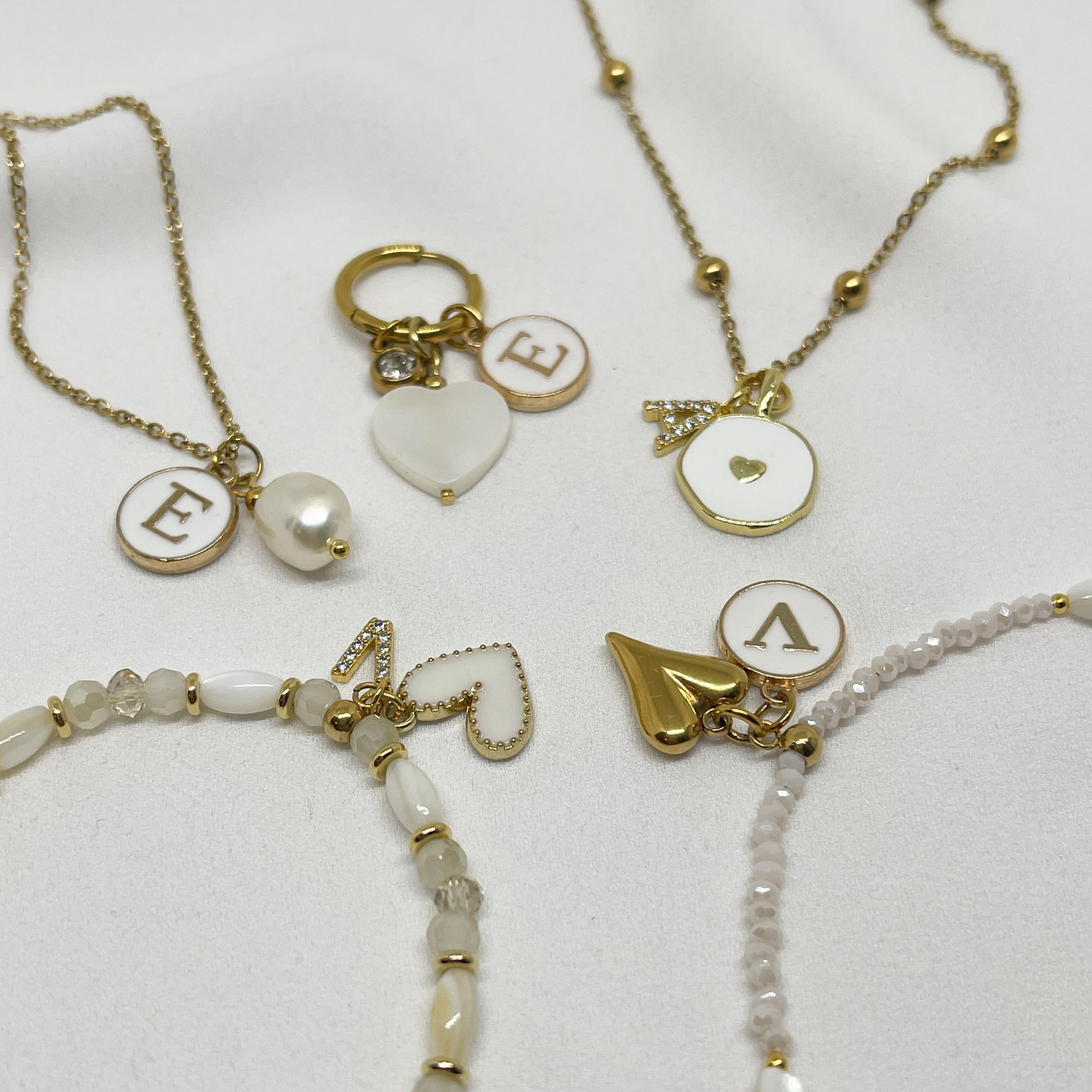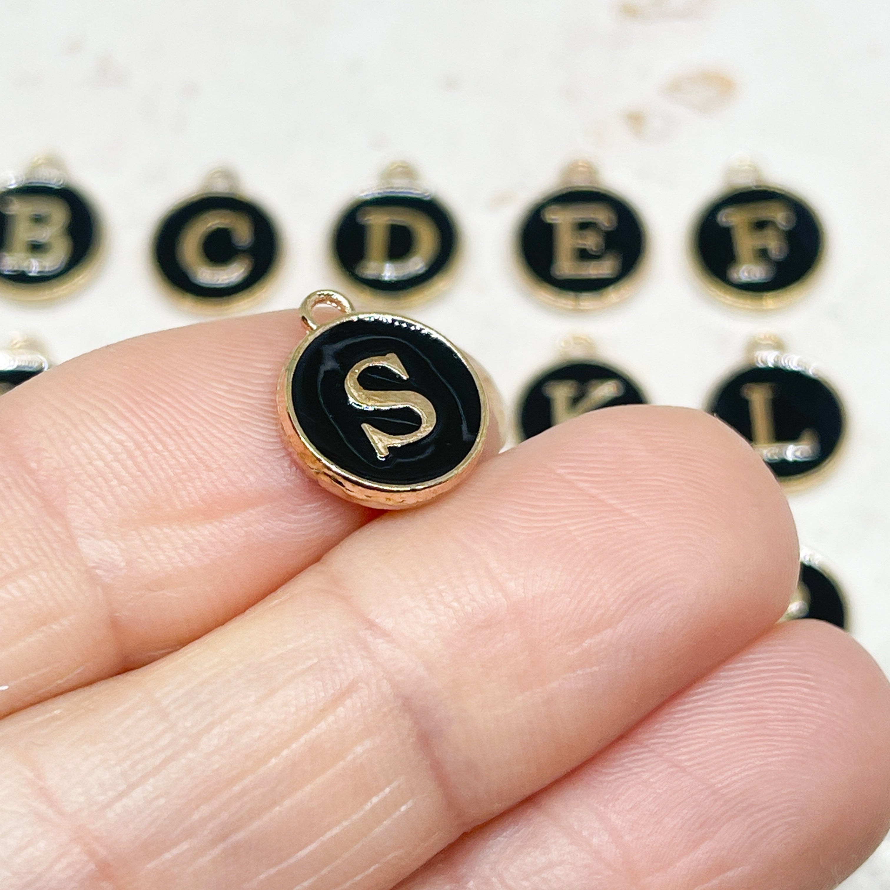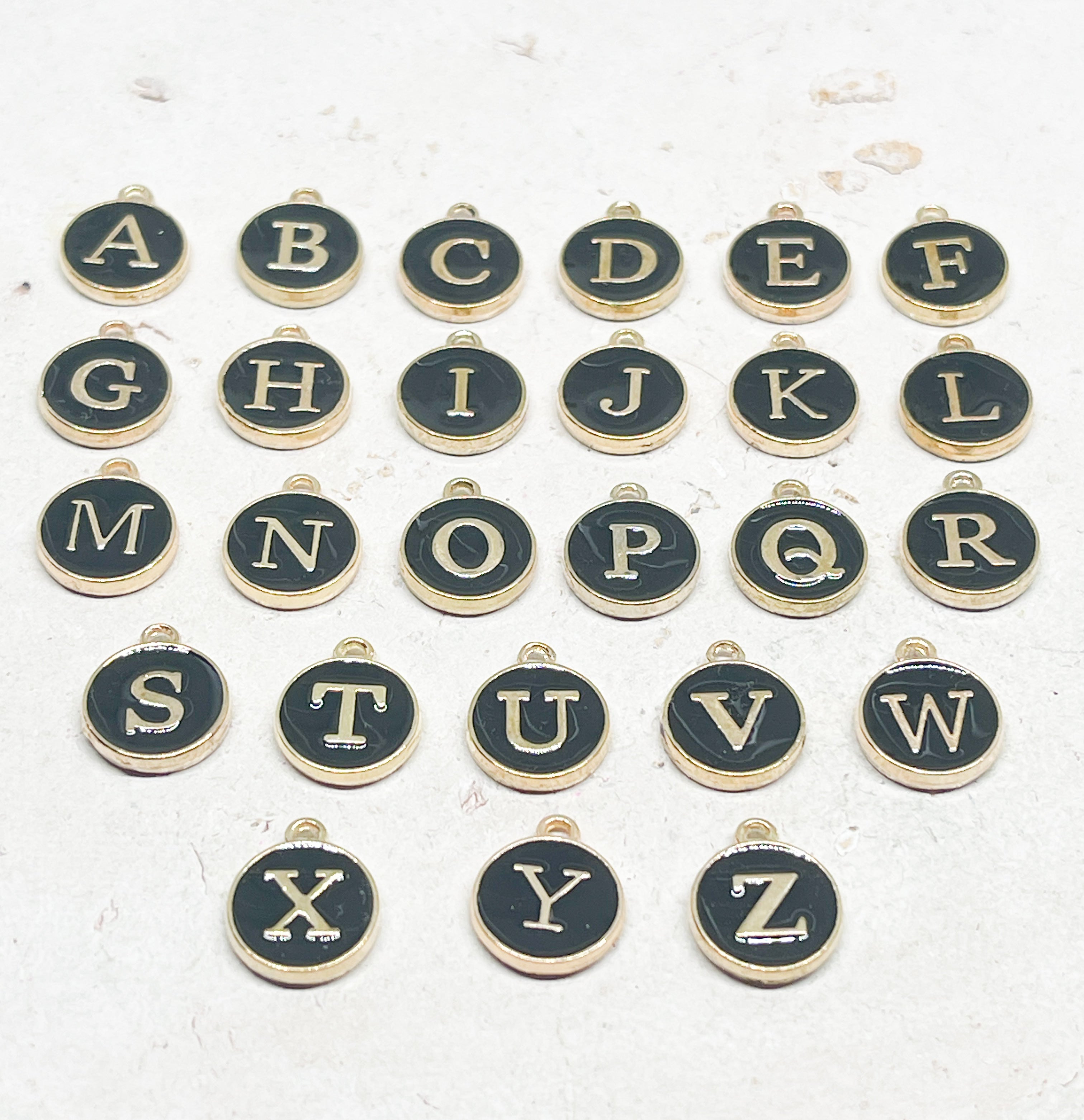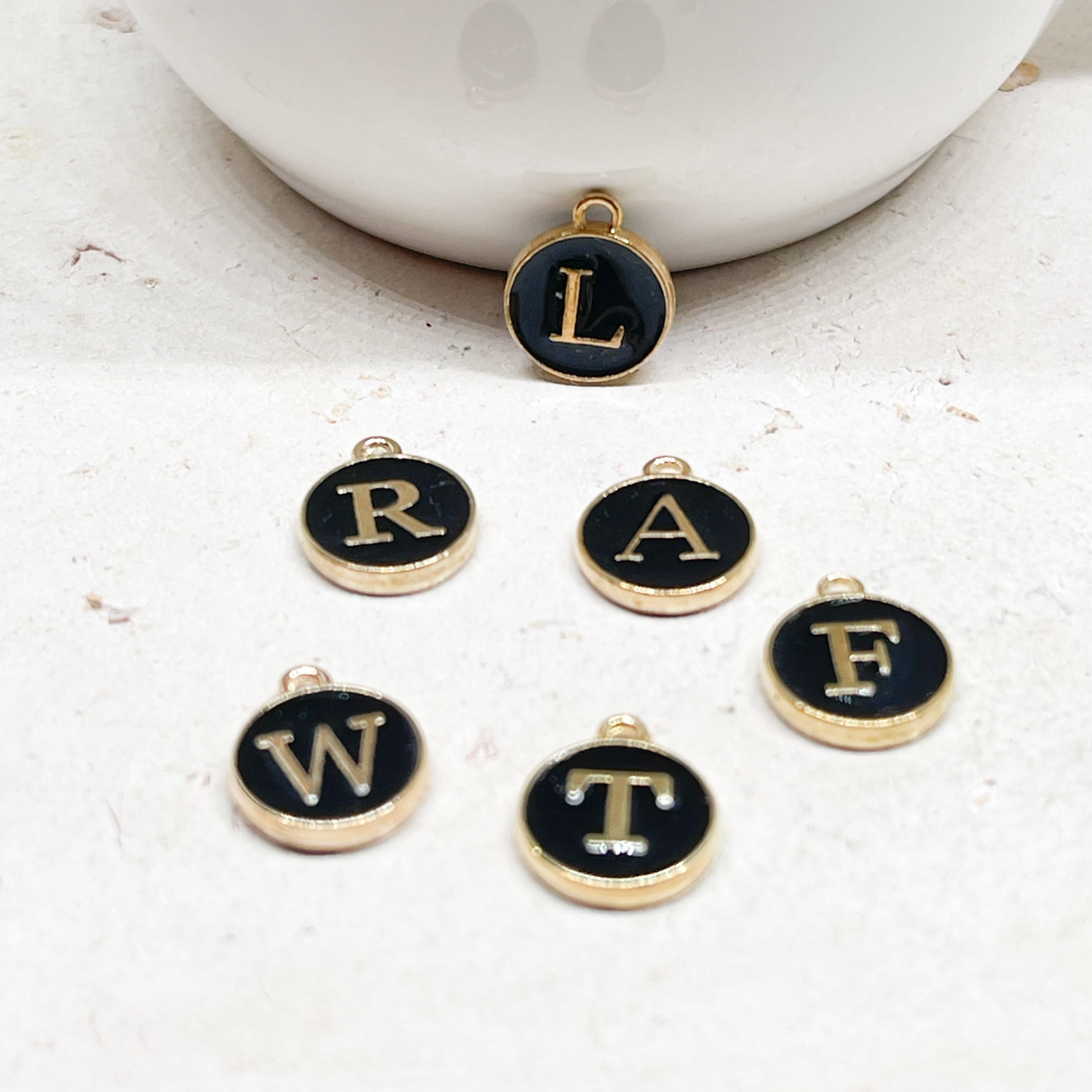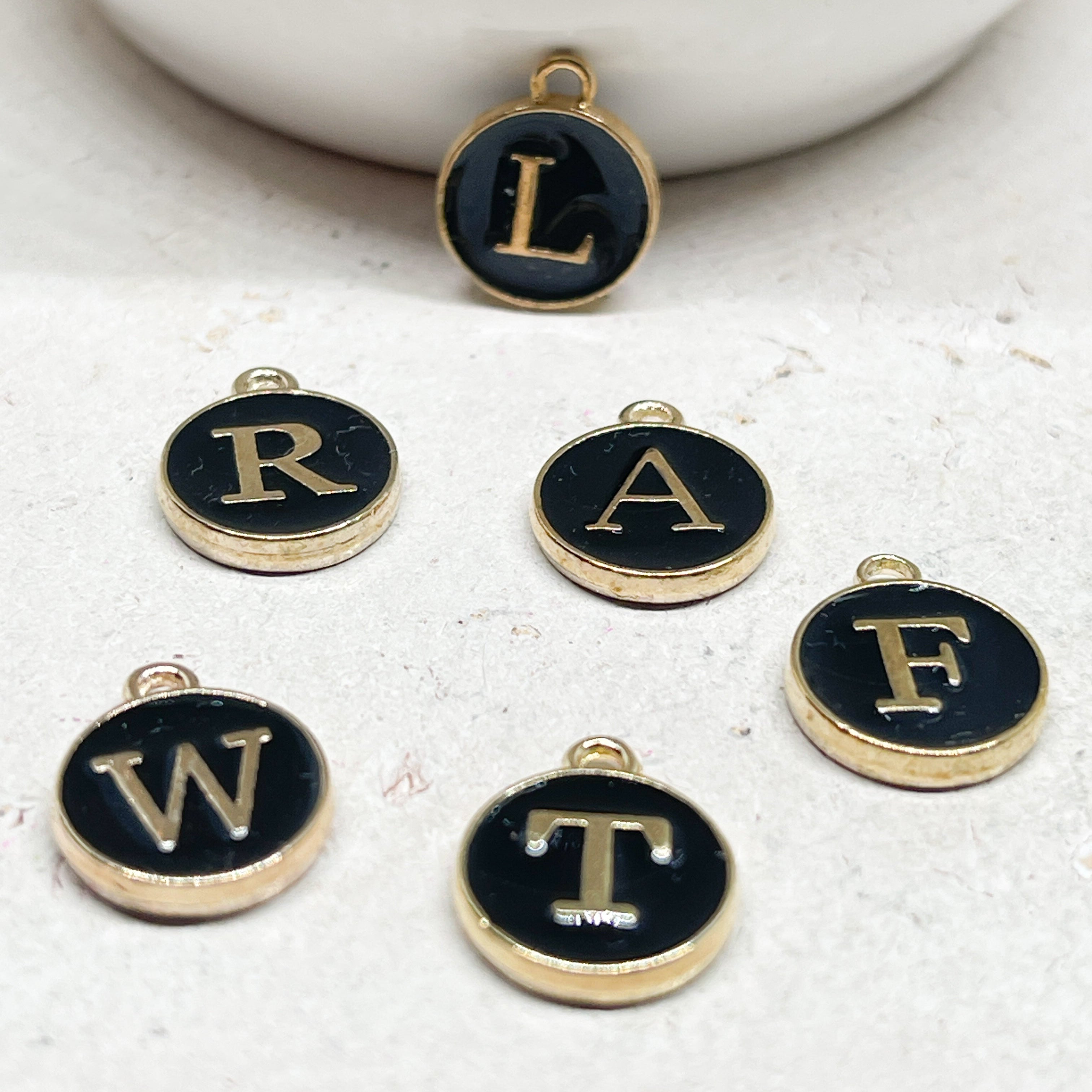 Buchstaben Anhänger aus Emaille, Schwarz mit goldfarbener Schrift, 14K vergoldet.