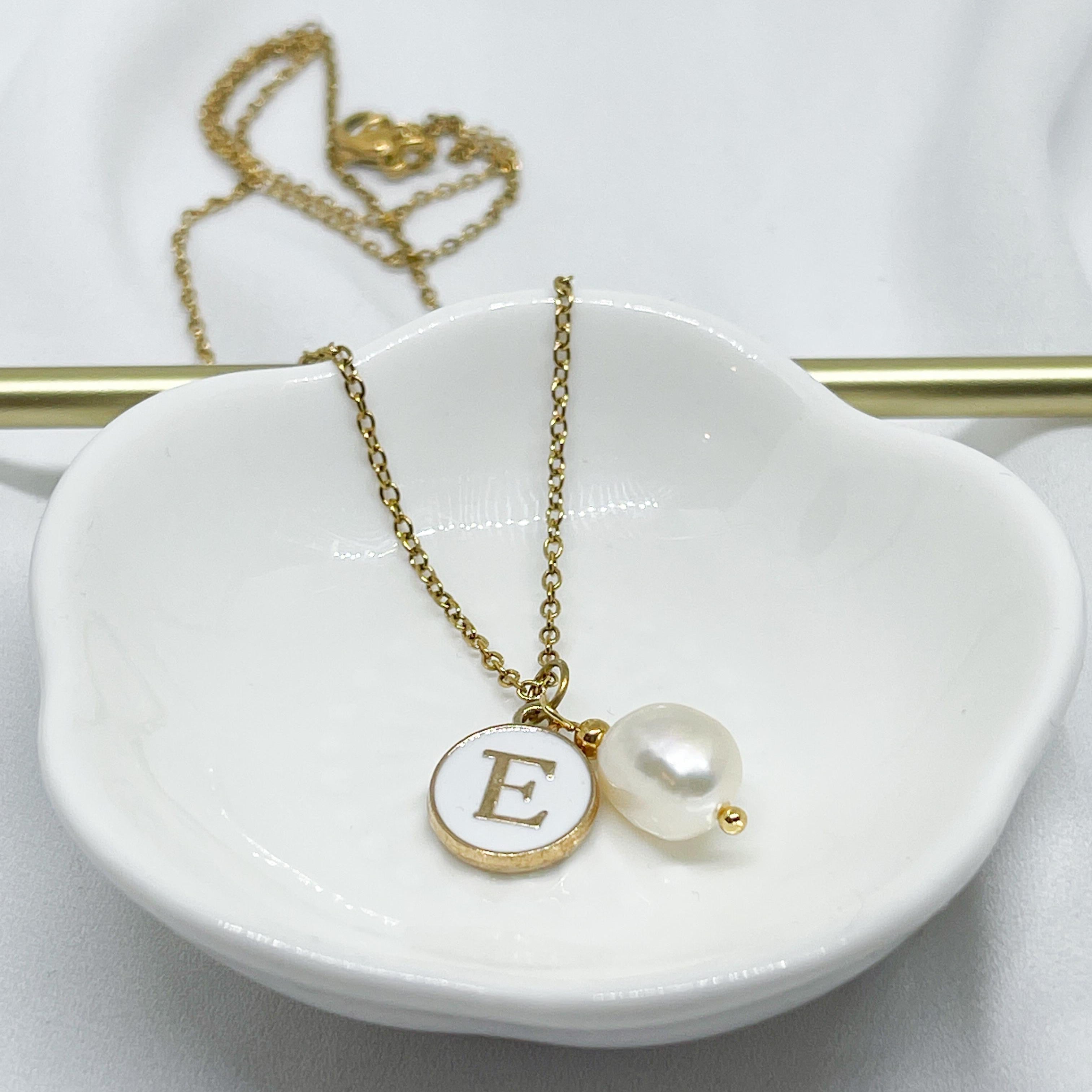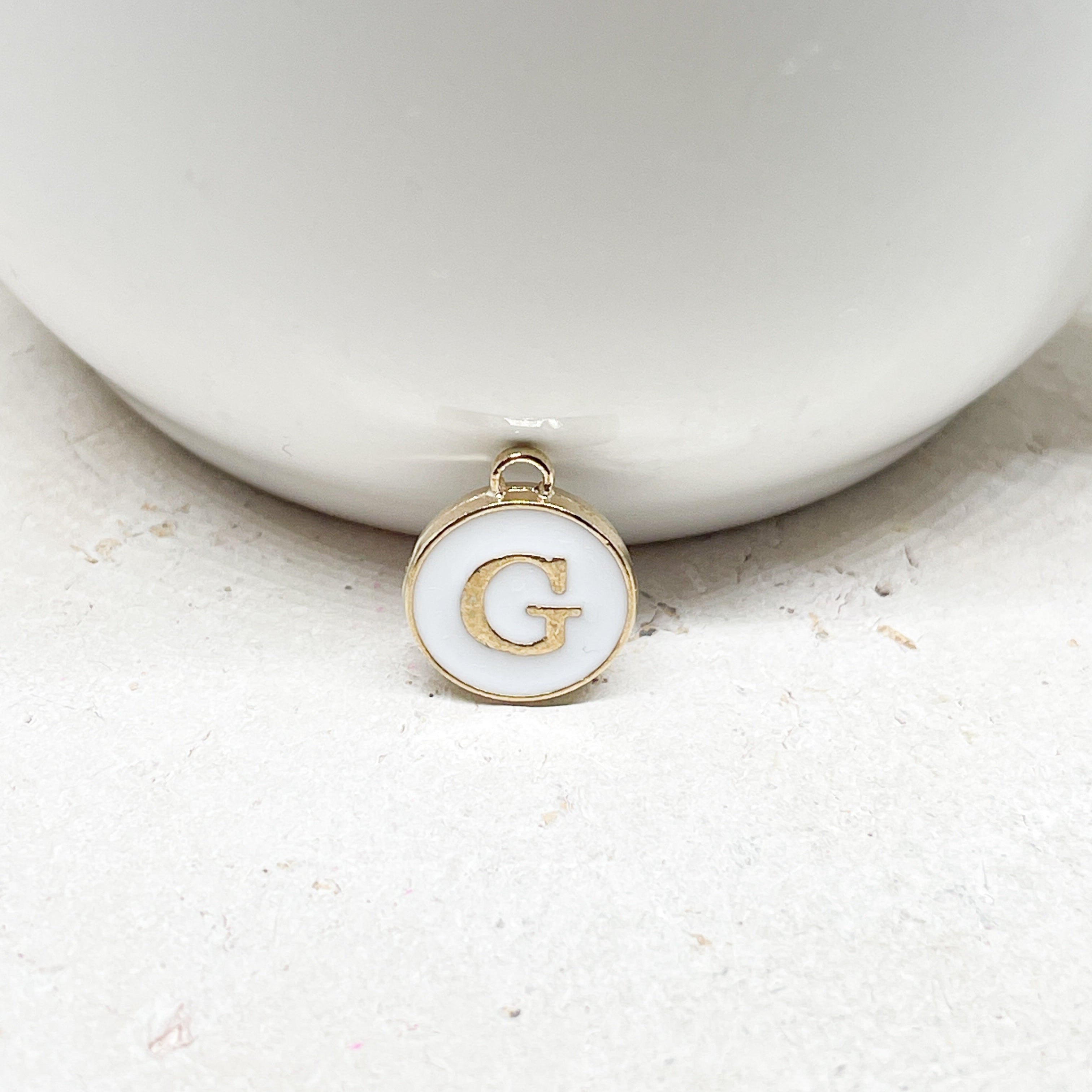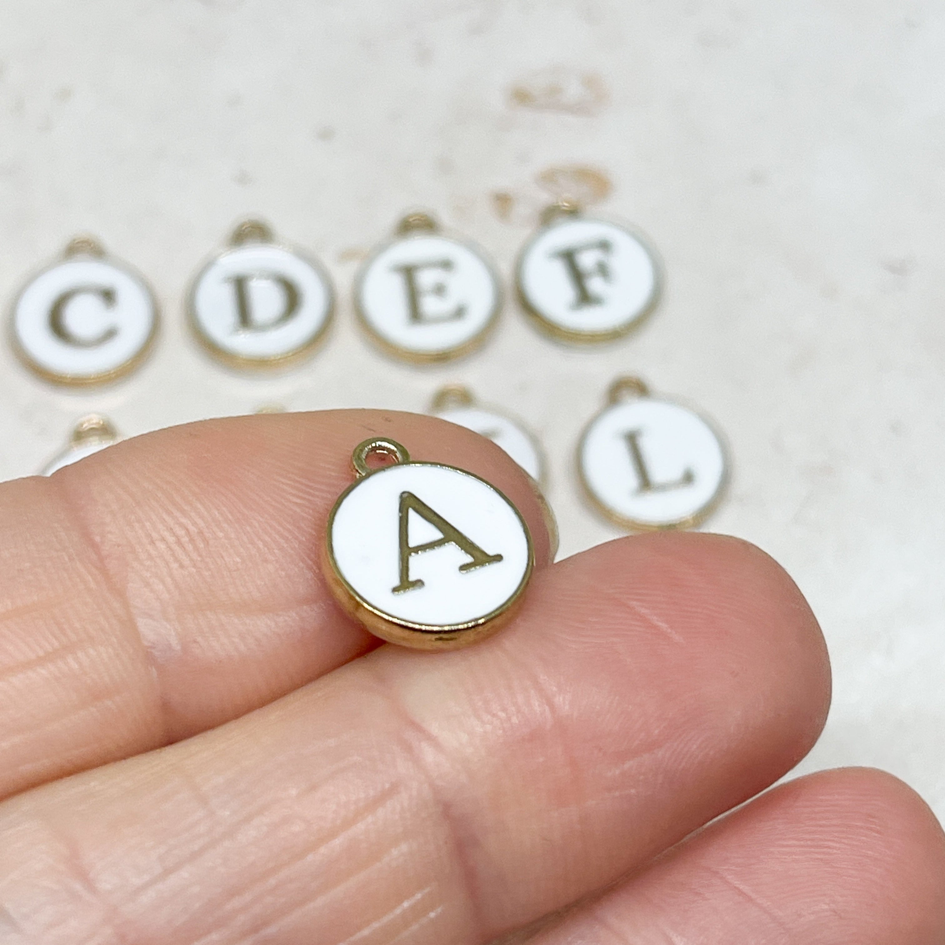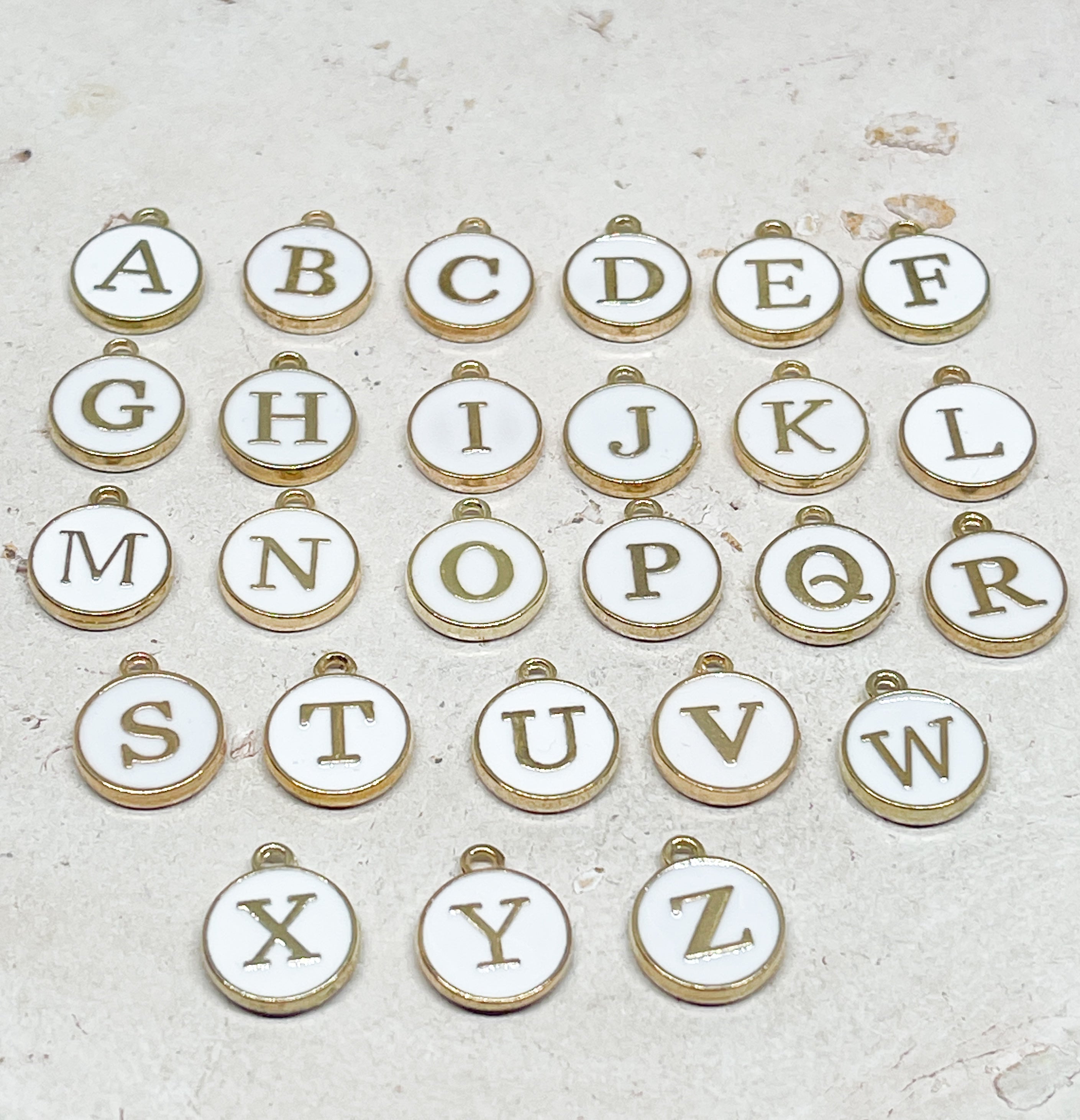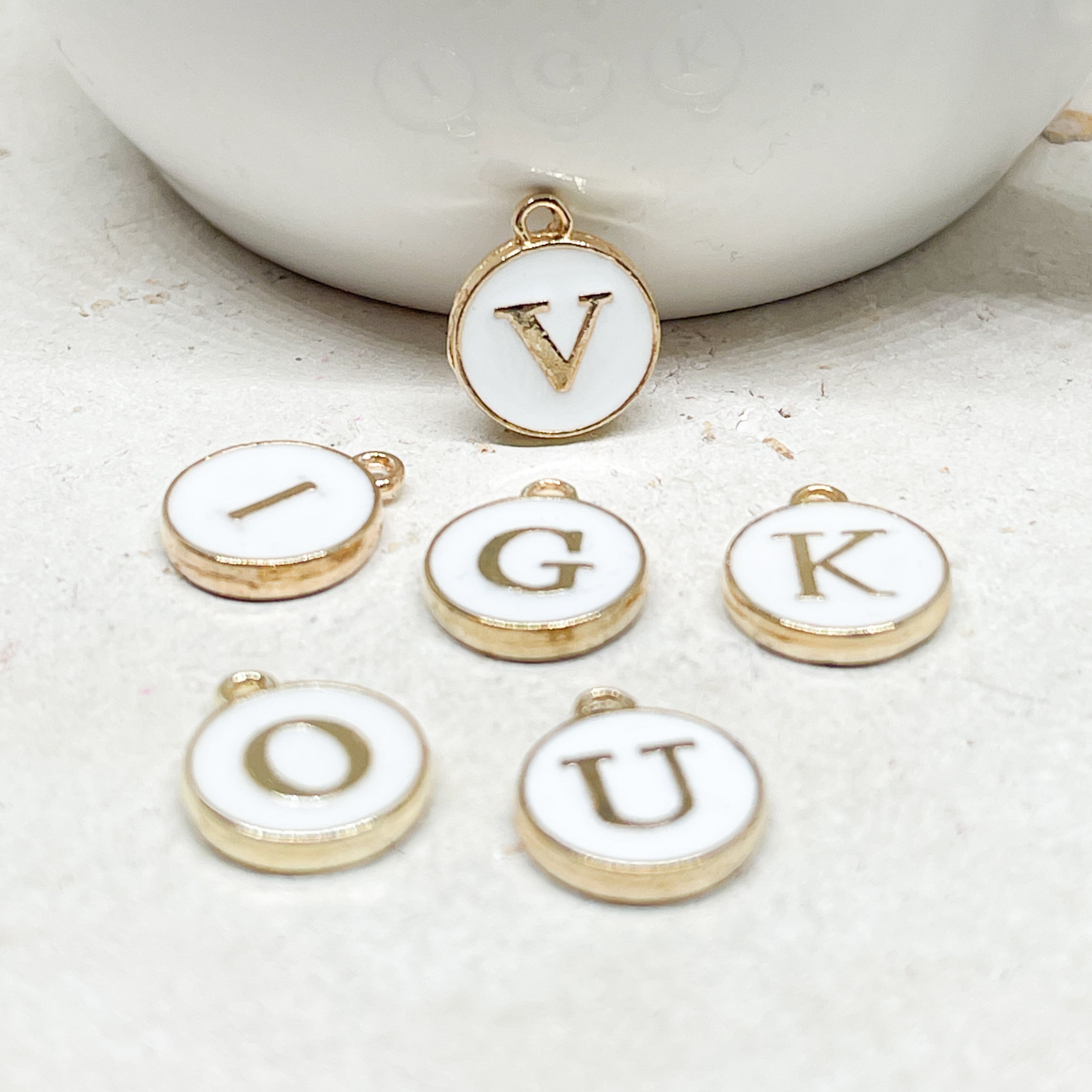 Buchstaben Anhänger aus Emaille, Weiß mit goldfarbener Schrift, 14K vergoldet.