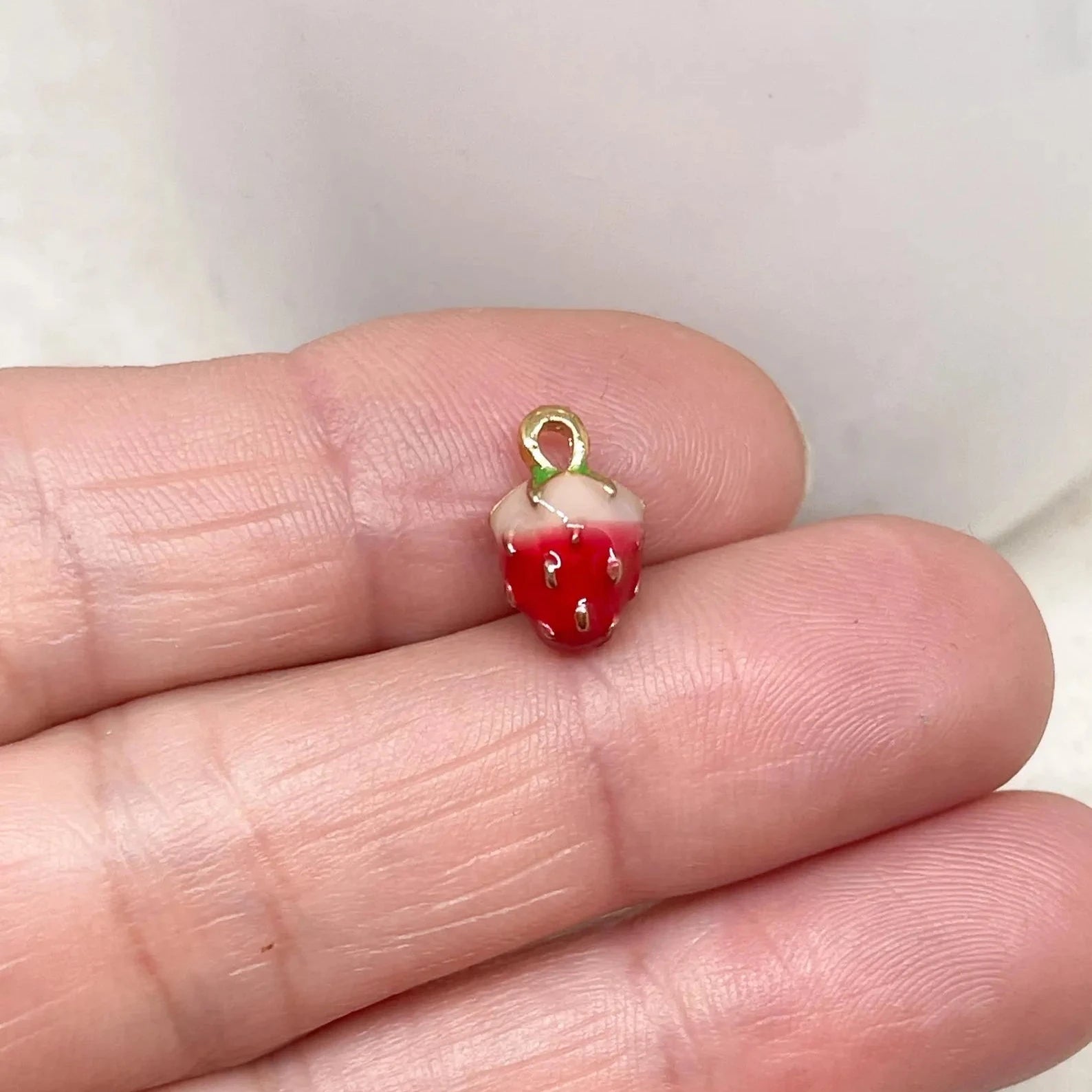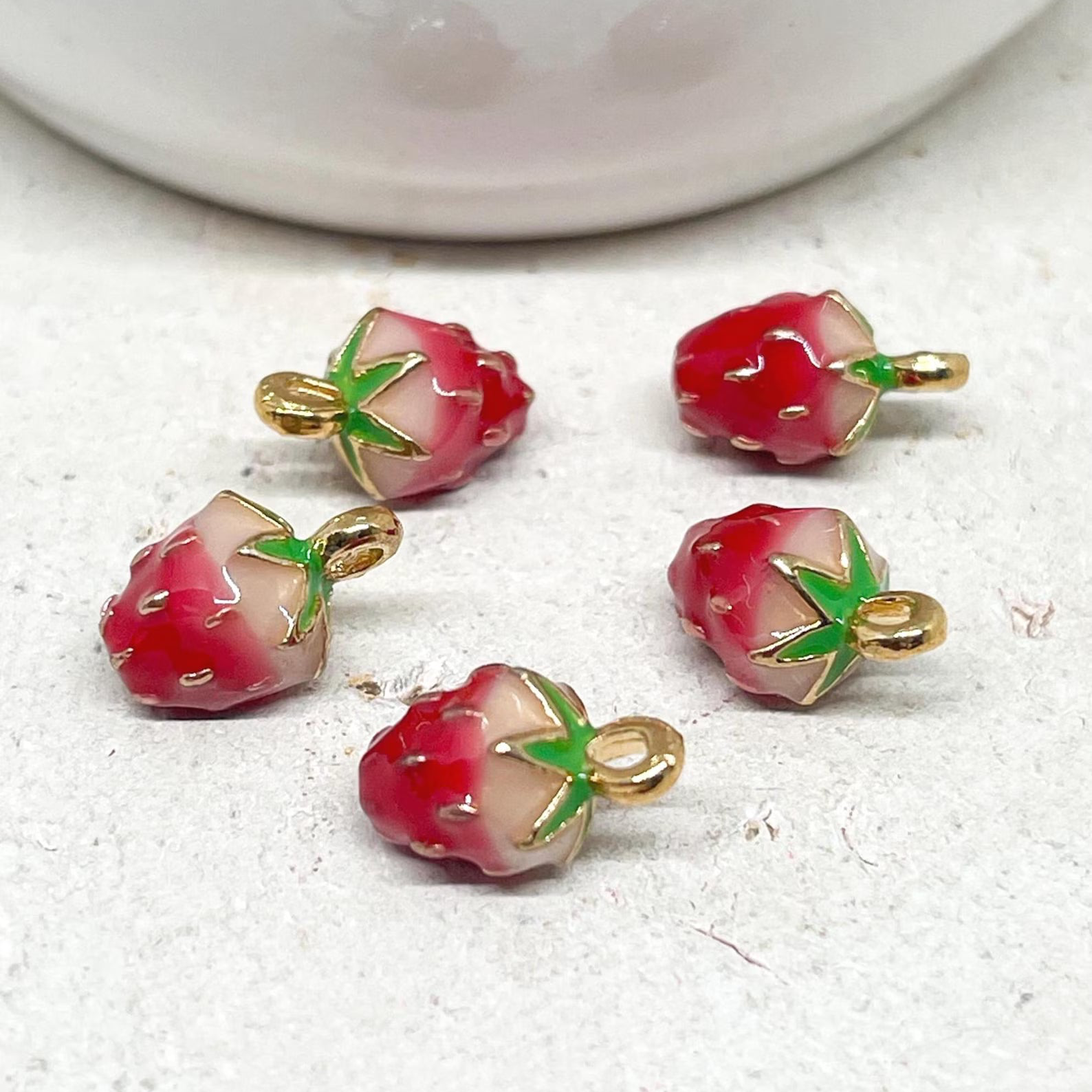 Kleine Emaille-Anhänger in Erdbeerform für Schmuck- und Bastelarbeiten. Ideal für Ohrringe, Armbänder, Ketten und DIY-Projekte. Die farbenfrohe Emaille in Kombination mit goldfarbenem Messing sorgt für einen verspielten Look.