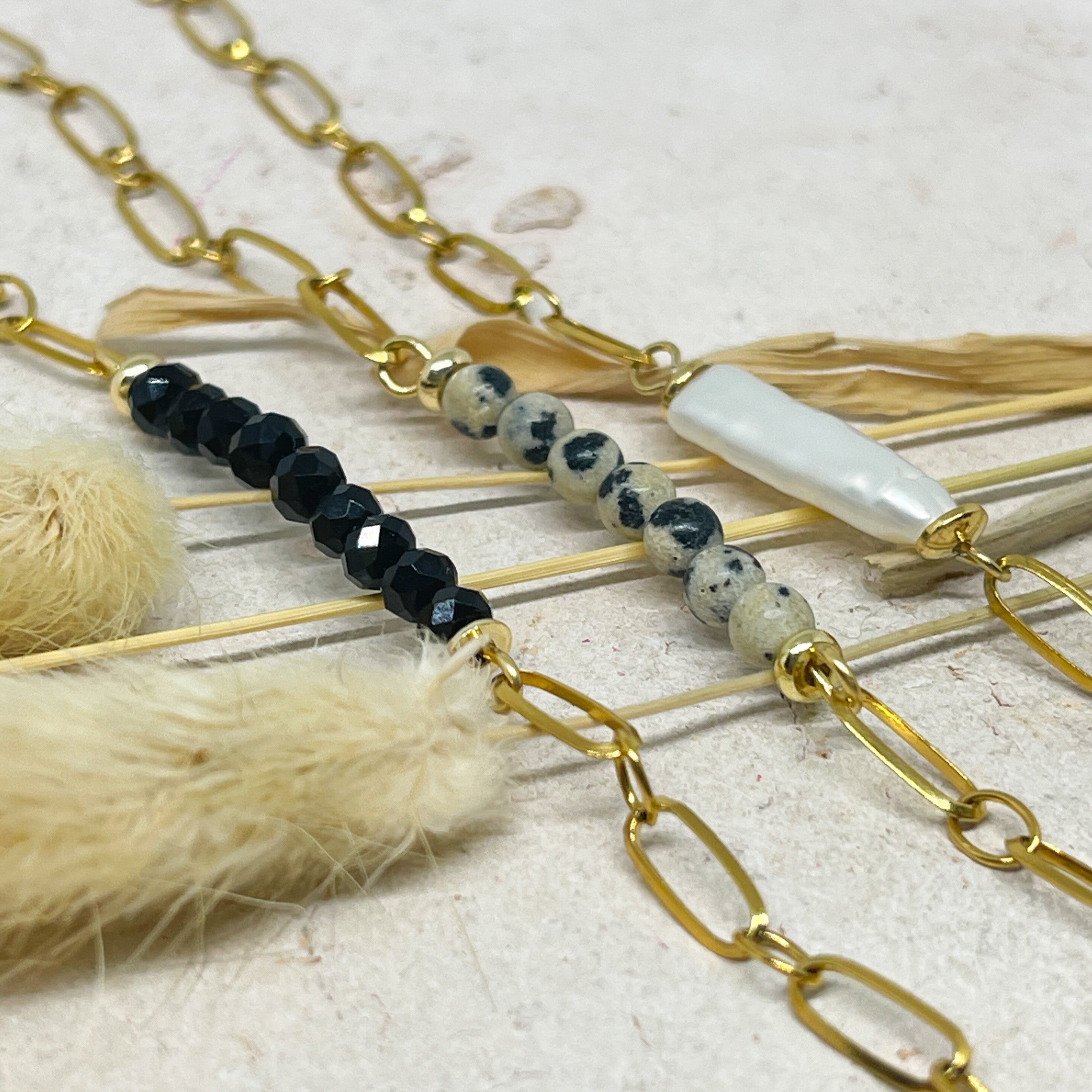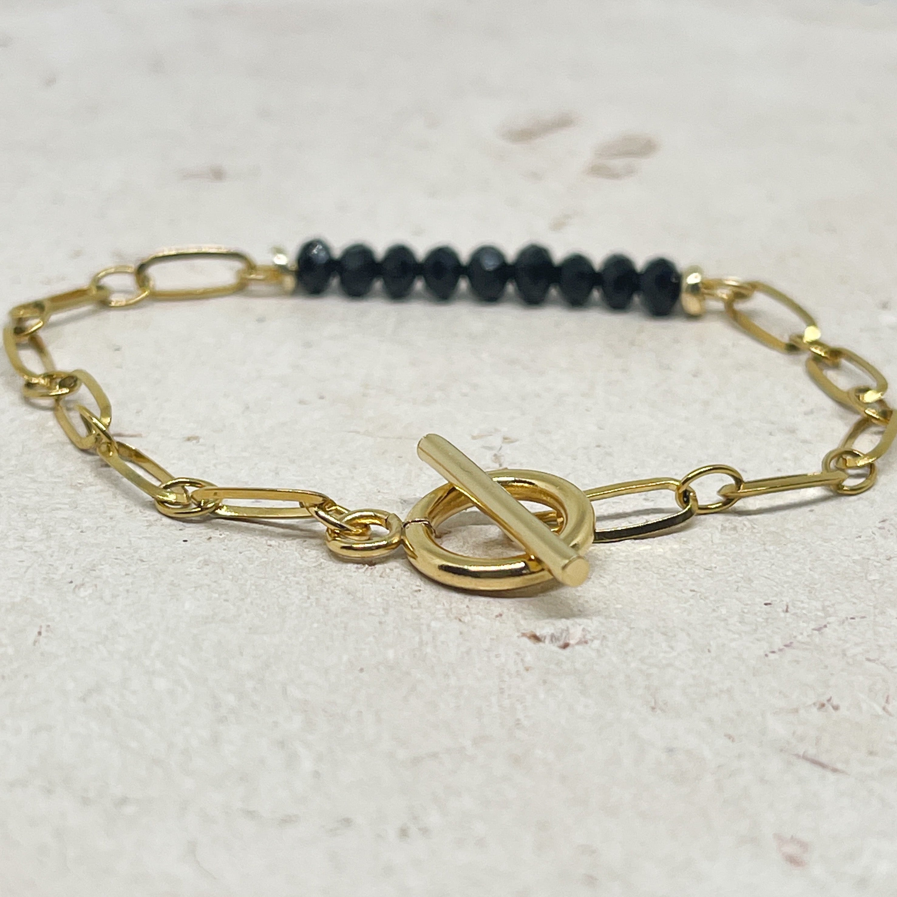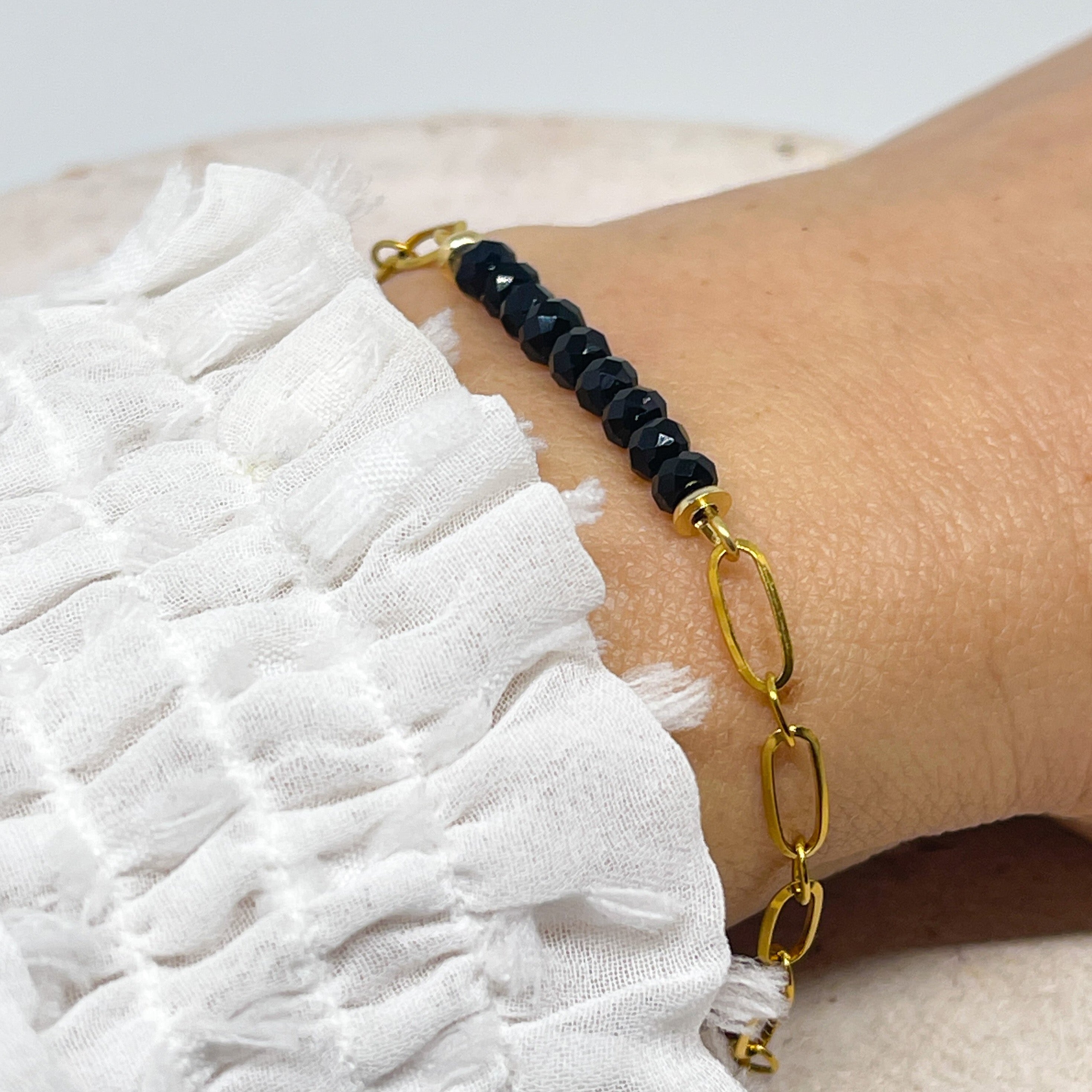 Armband mit schwarzen Kristallperlen und Büroklammer Kette aus vergoldetem Edelstahl.