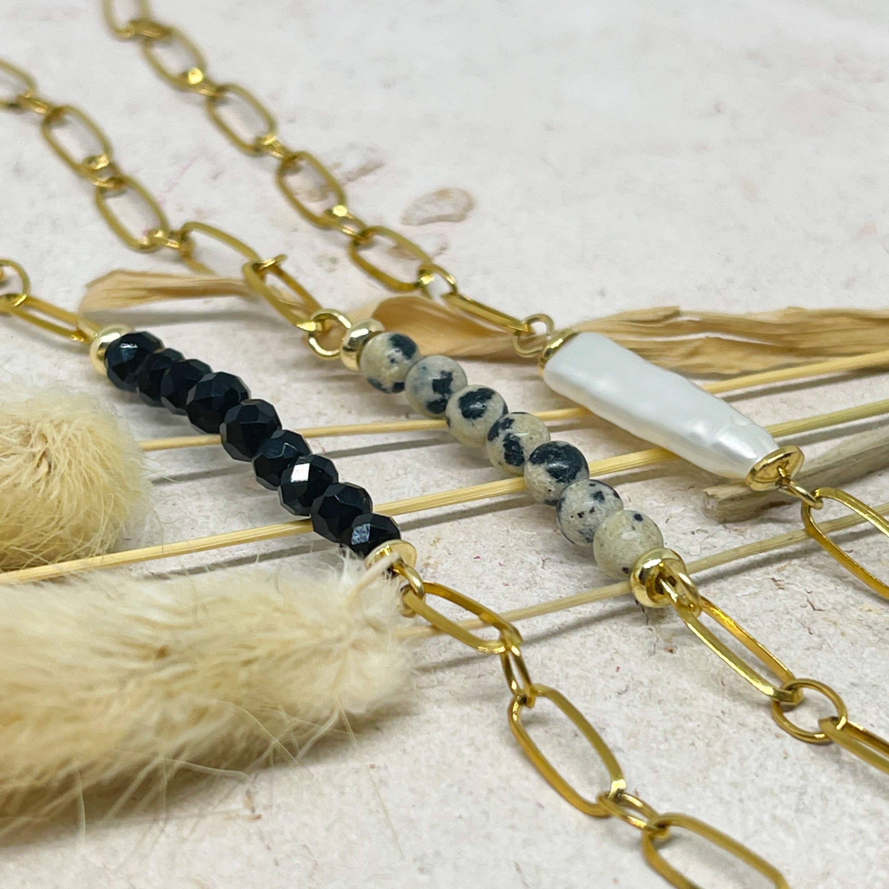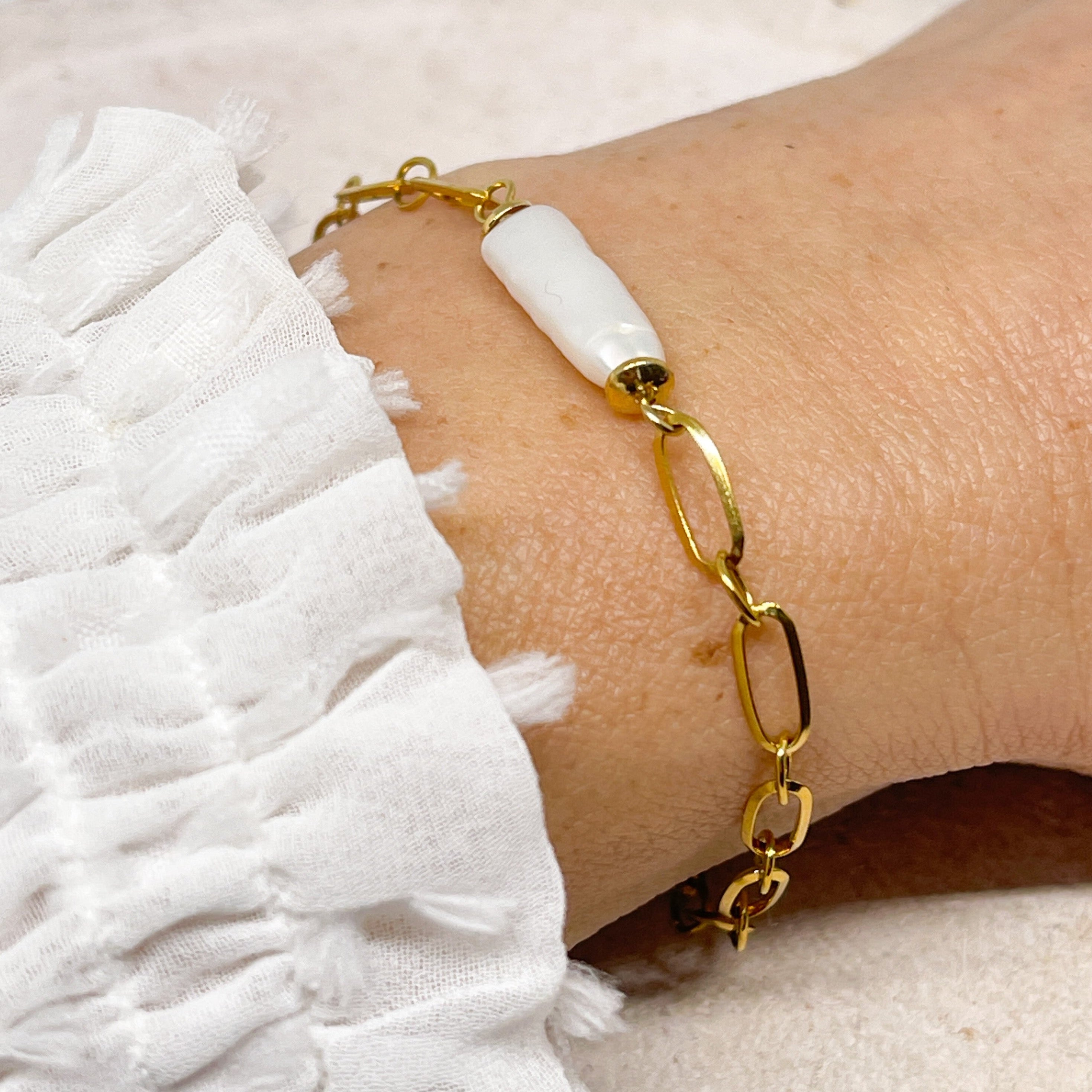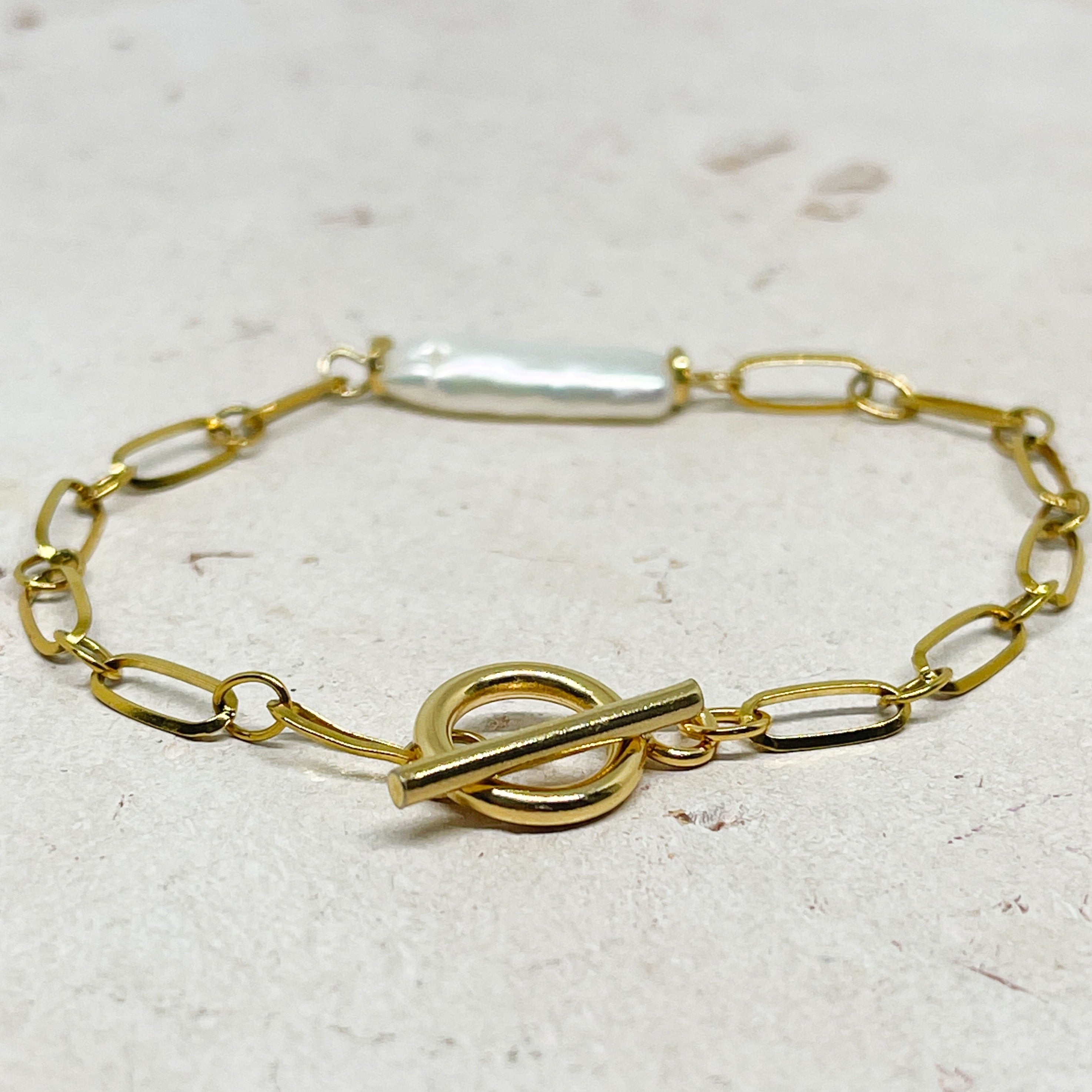 Armbnad mit einer Süßwasserperle und Büroklammerkette aus vergoldetem Edelstahl.