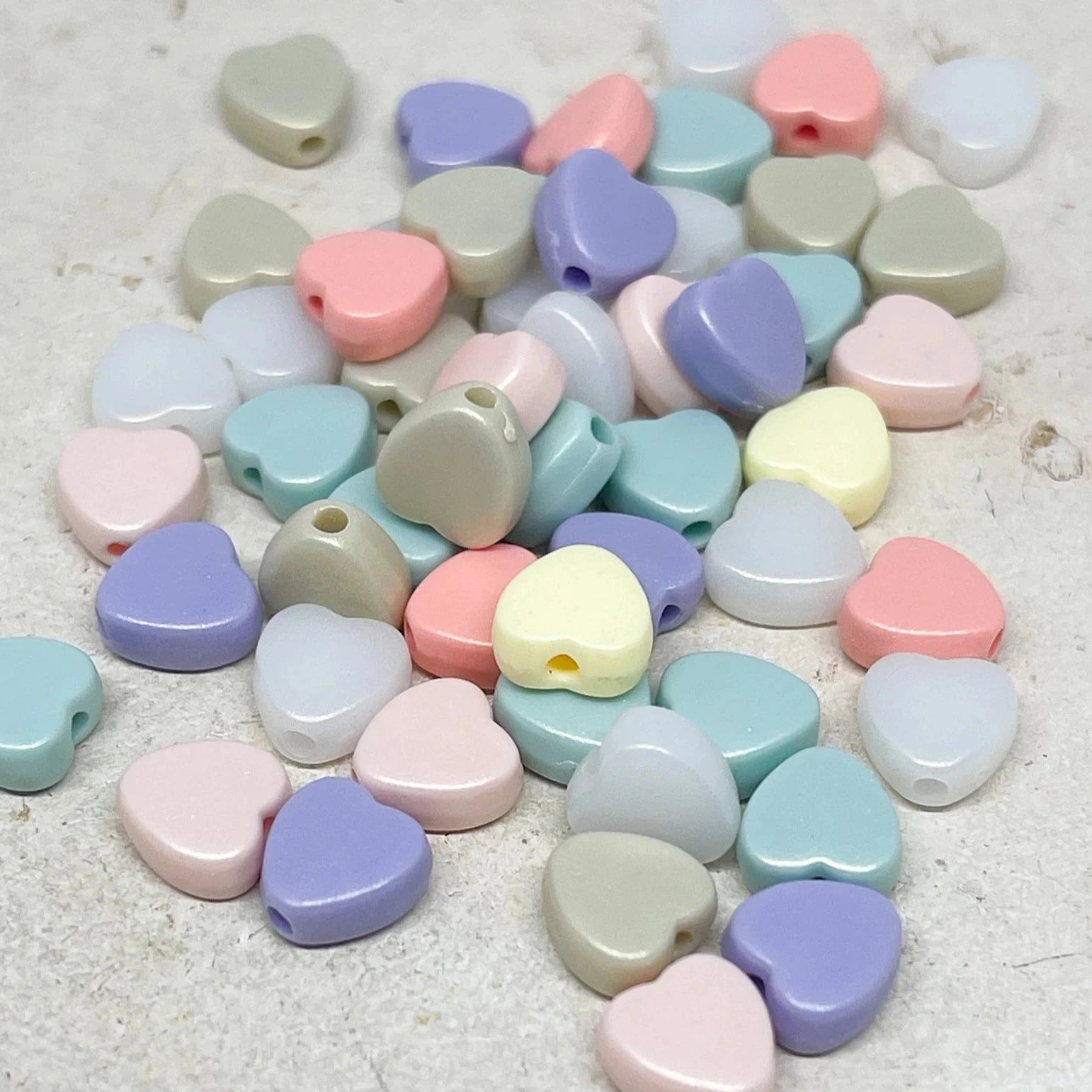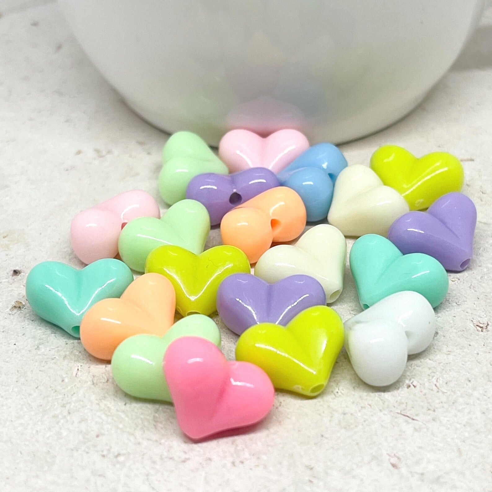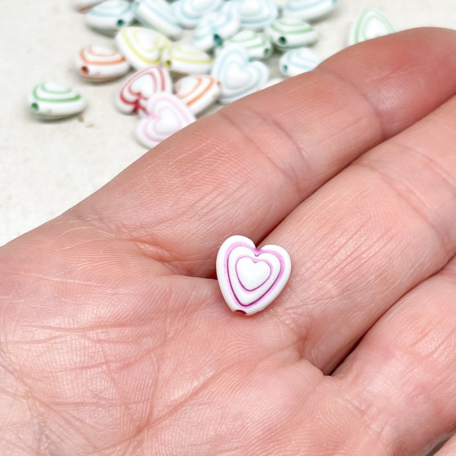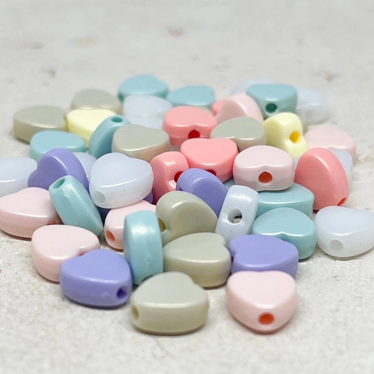 Unsere Herzperlen aus Acryl sind leicht, farbenfroh und angenehm zu tragen – erhältlich in Pastelltönen, knalligen Farben oder transparentem Glitzerlook, meist in Größen zwischen 6–12 mm.