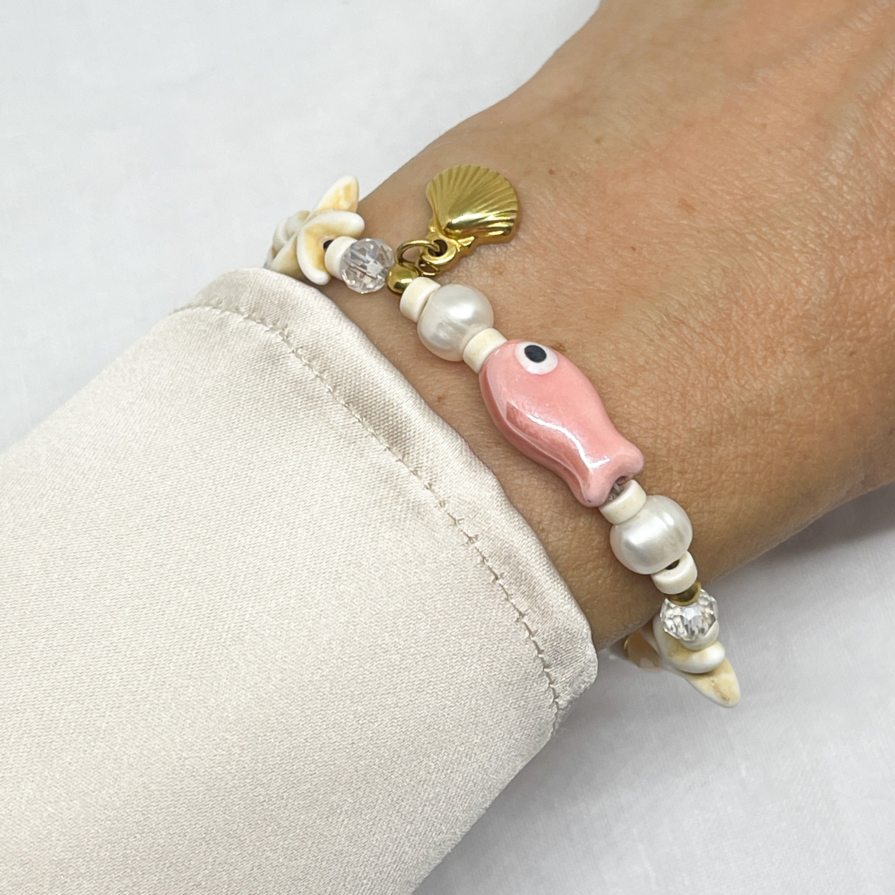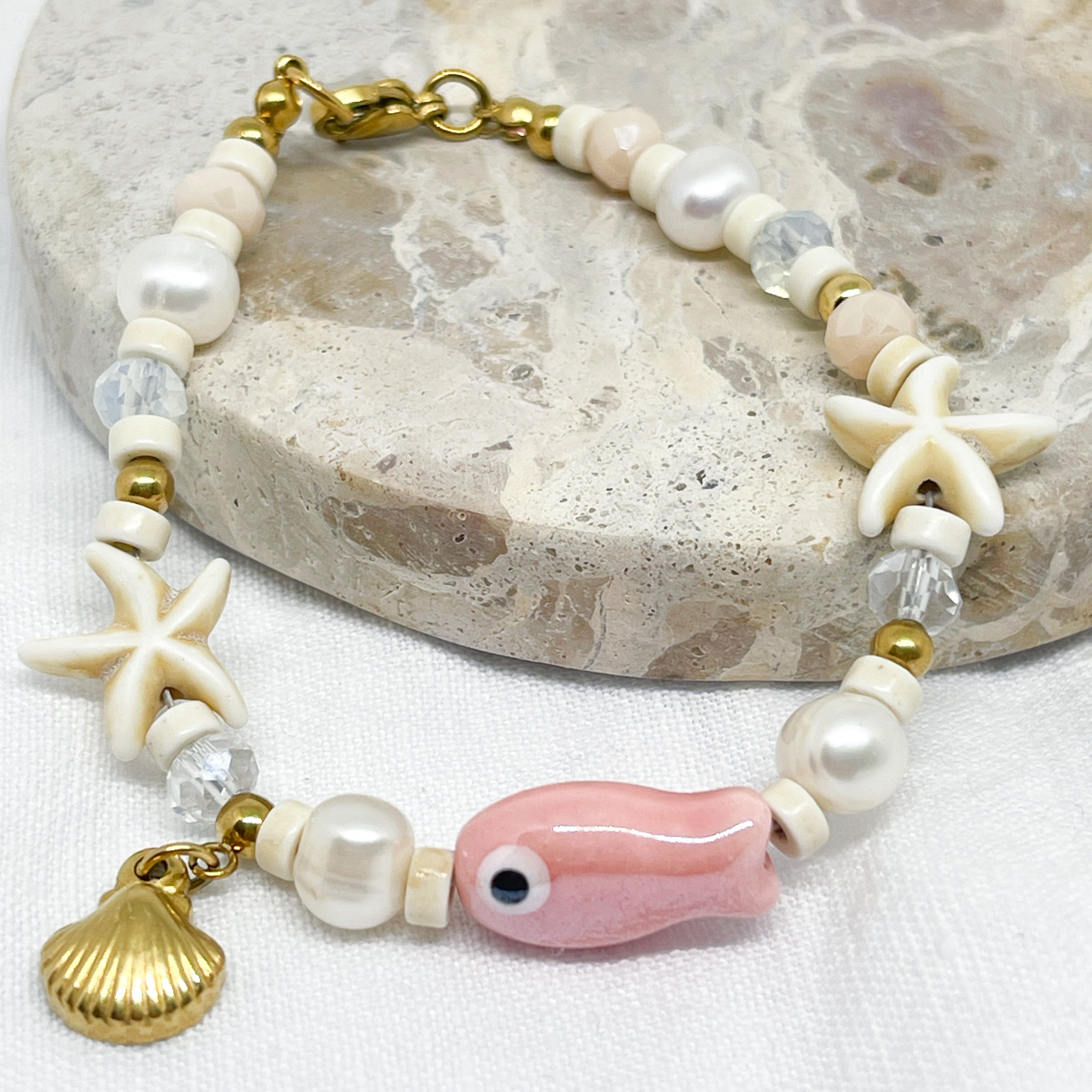 Sommerliches Armband mit Keramik Fisch, Süßwasser und Kristall Perlen und einem Edelstahl Charm.