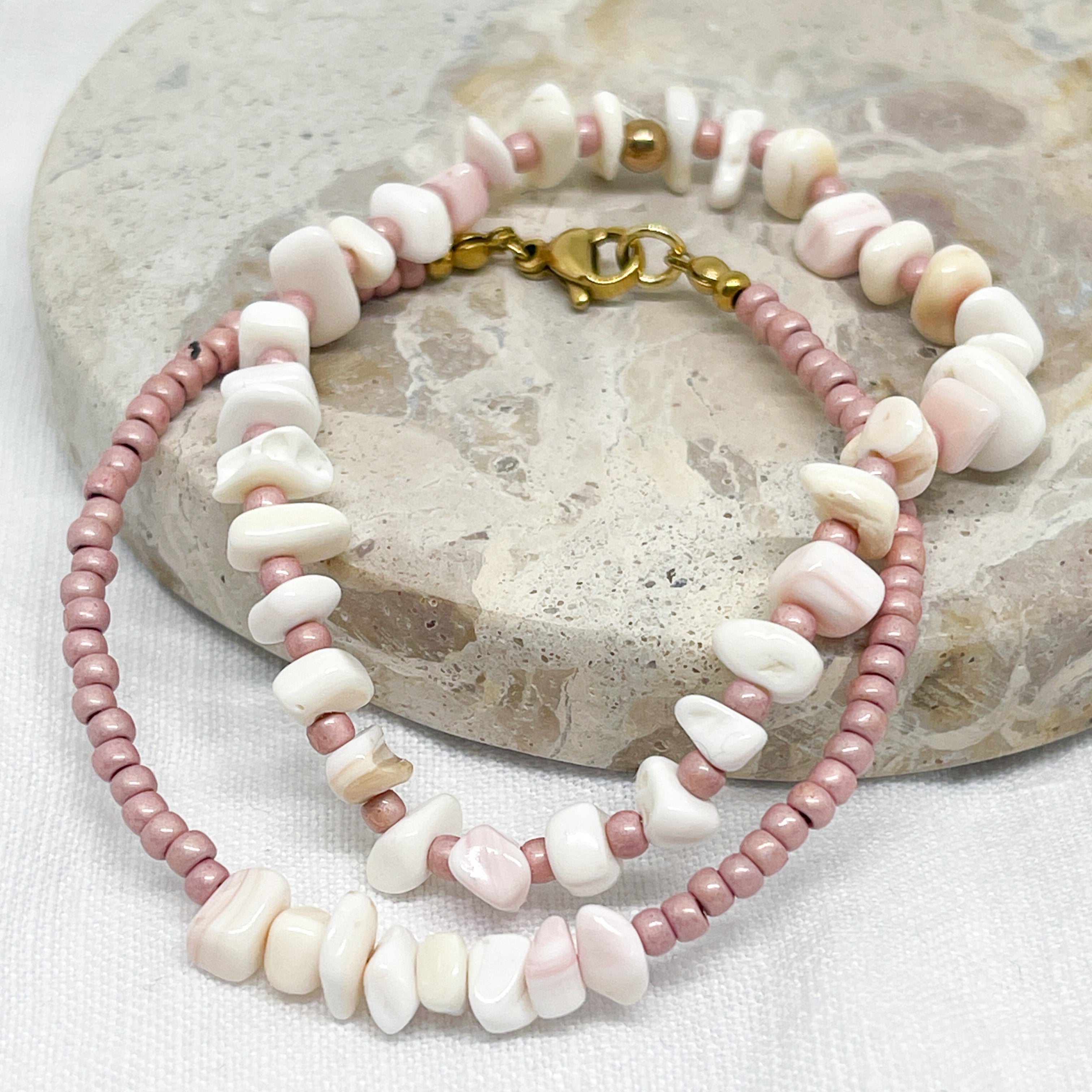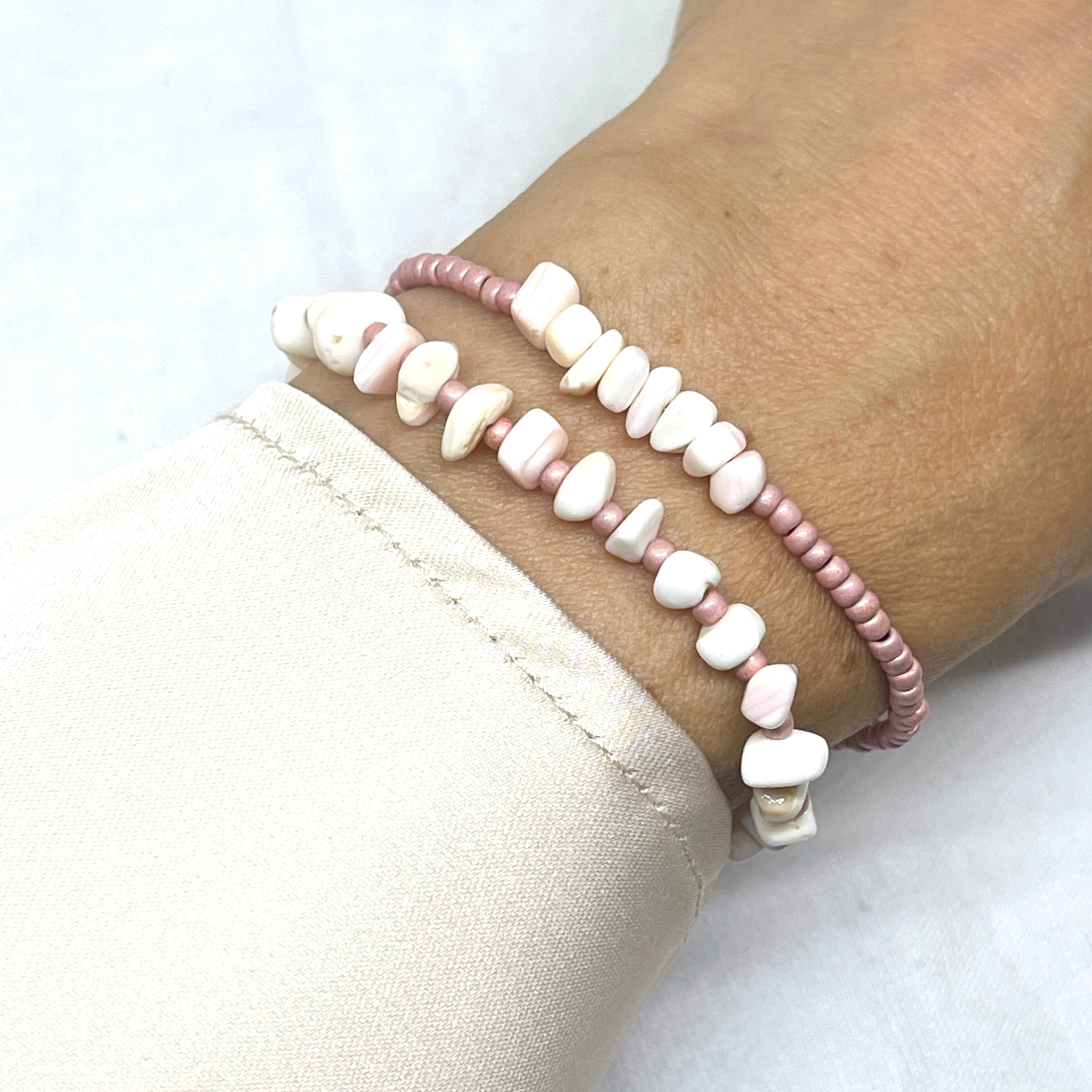 Armbandset aus Muschelsplitter Perlen und Glasperlen in Altrosa.
