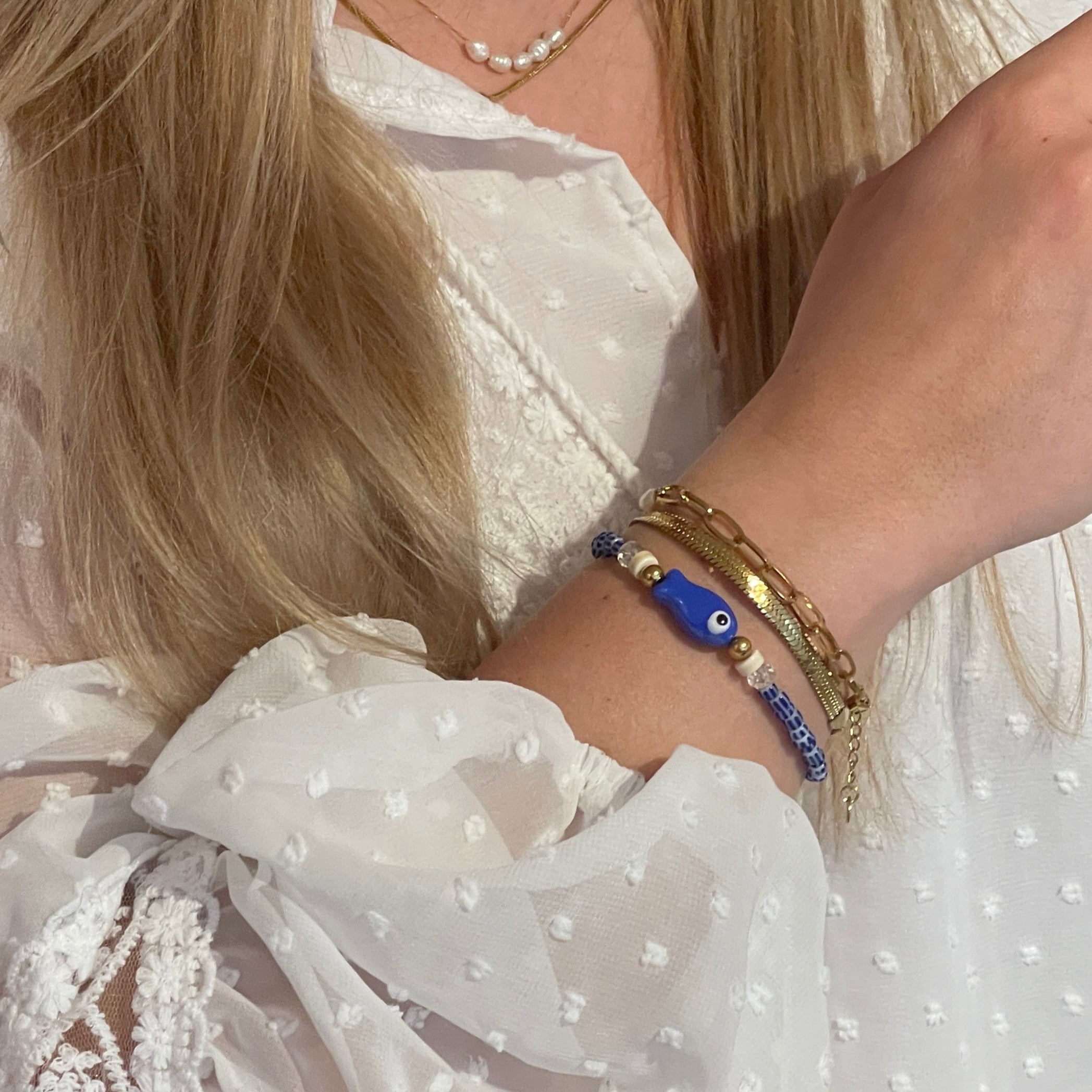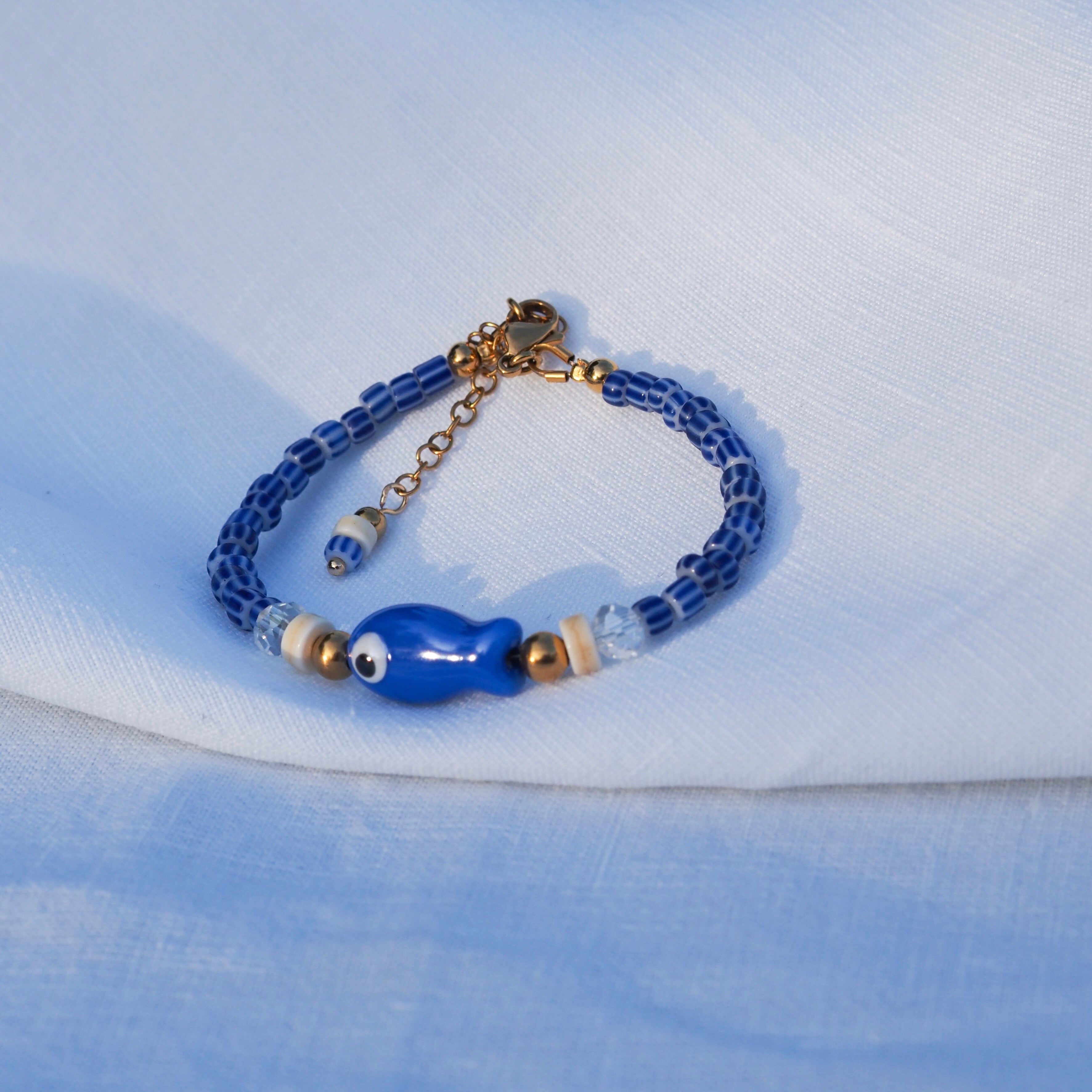 Sommerliches Armband mit Keramik Fisch, gestreiften Rocaille Perlen und kleinen Edelstahl Perlen.