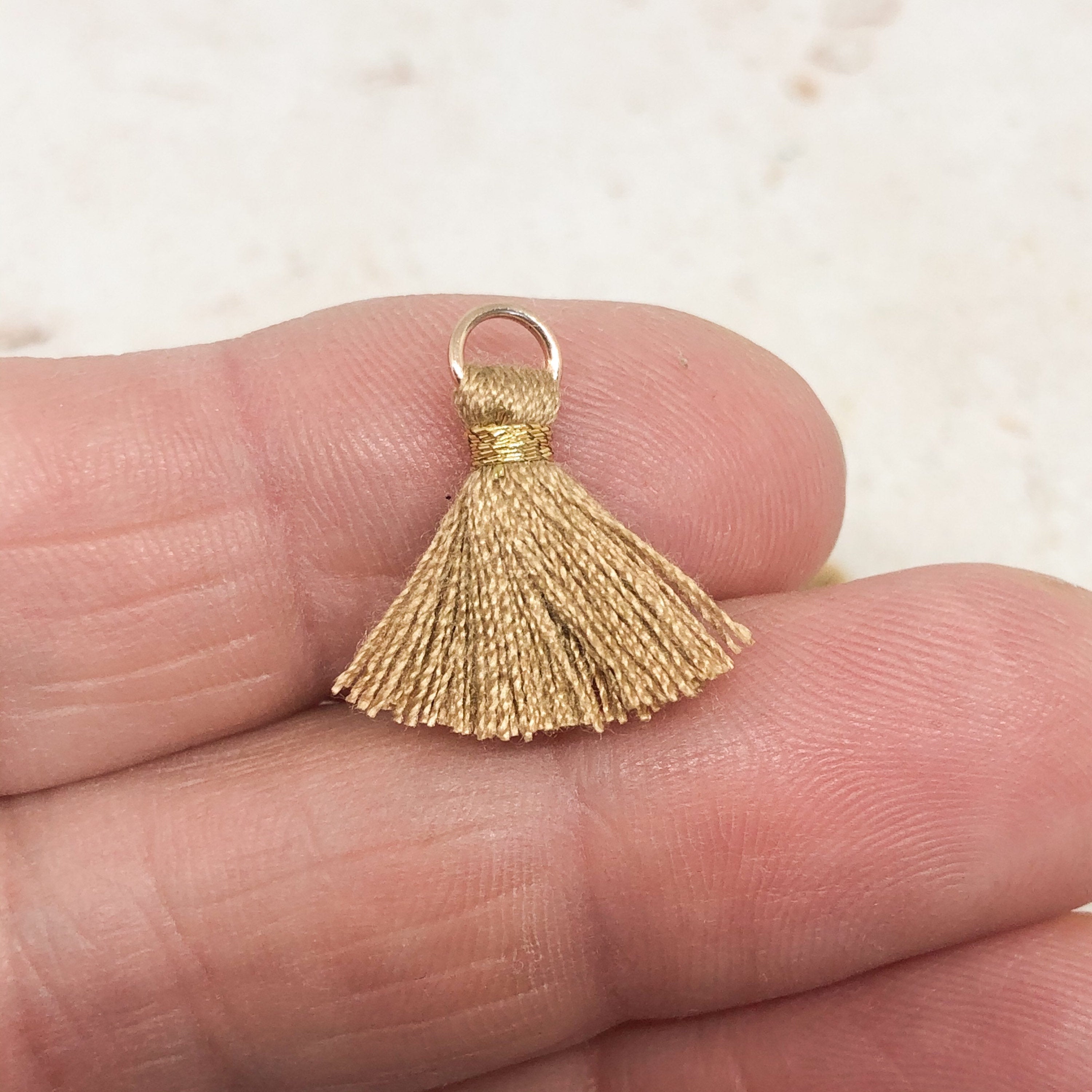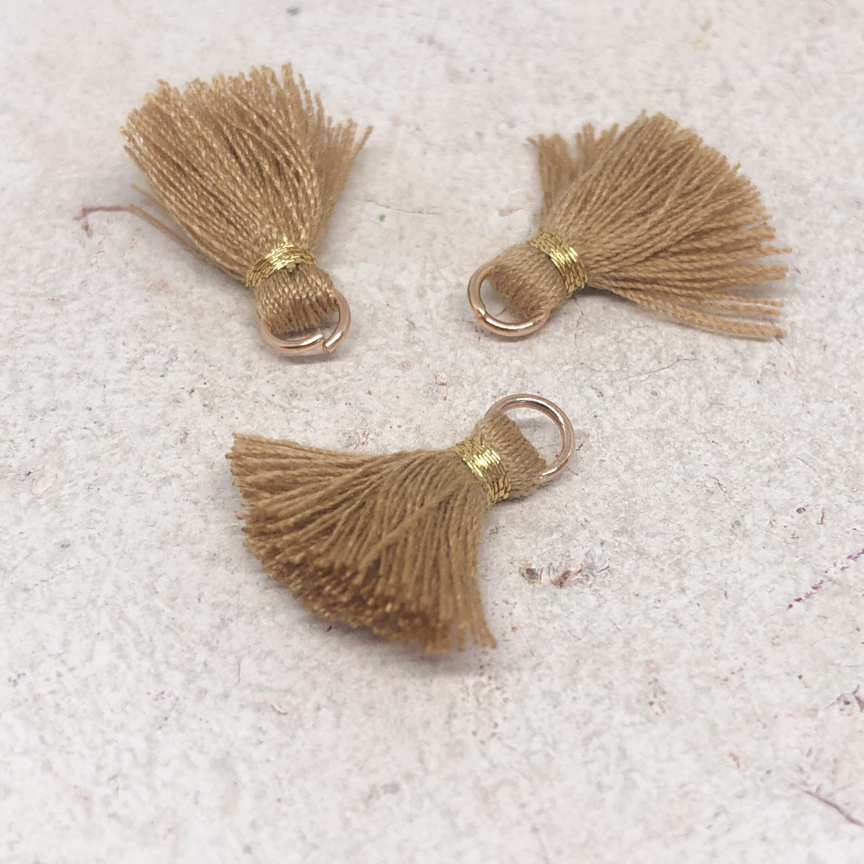 3 St. kleine Quasten, hellbraun, mit Öse goldfarben