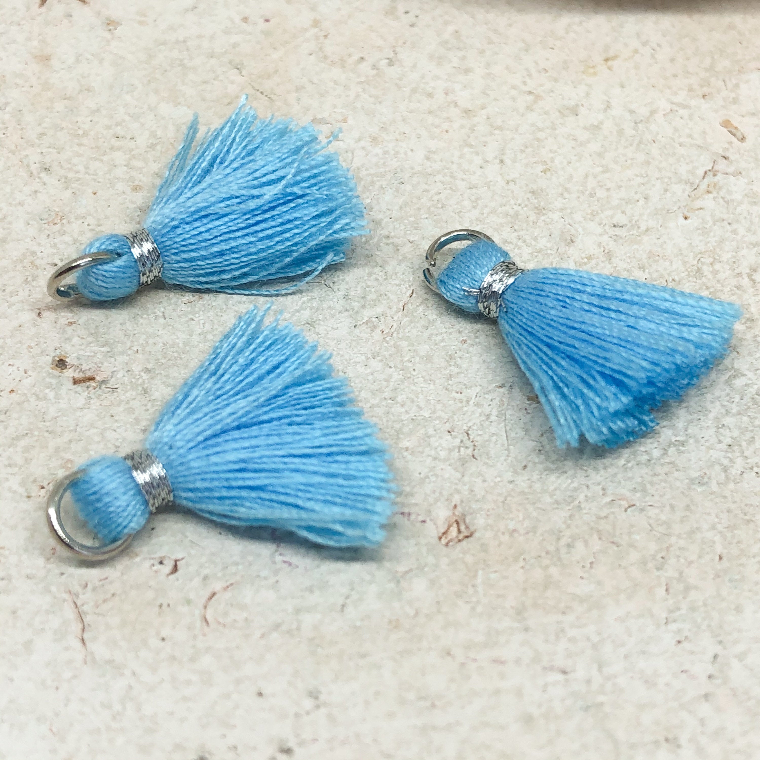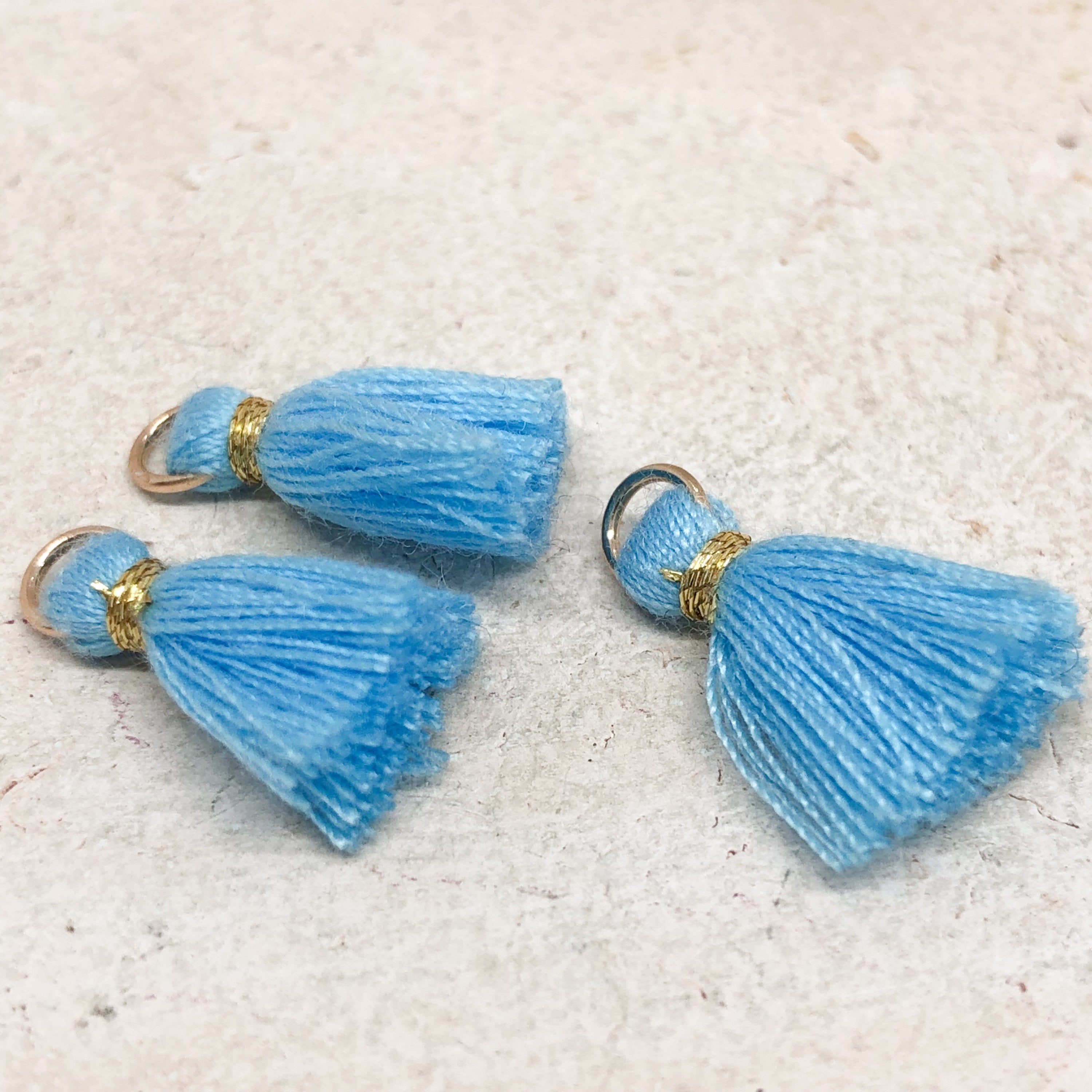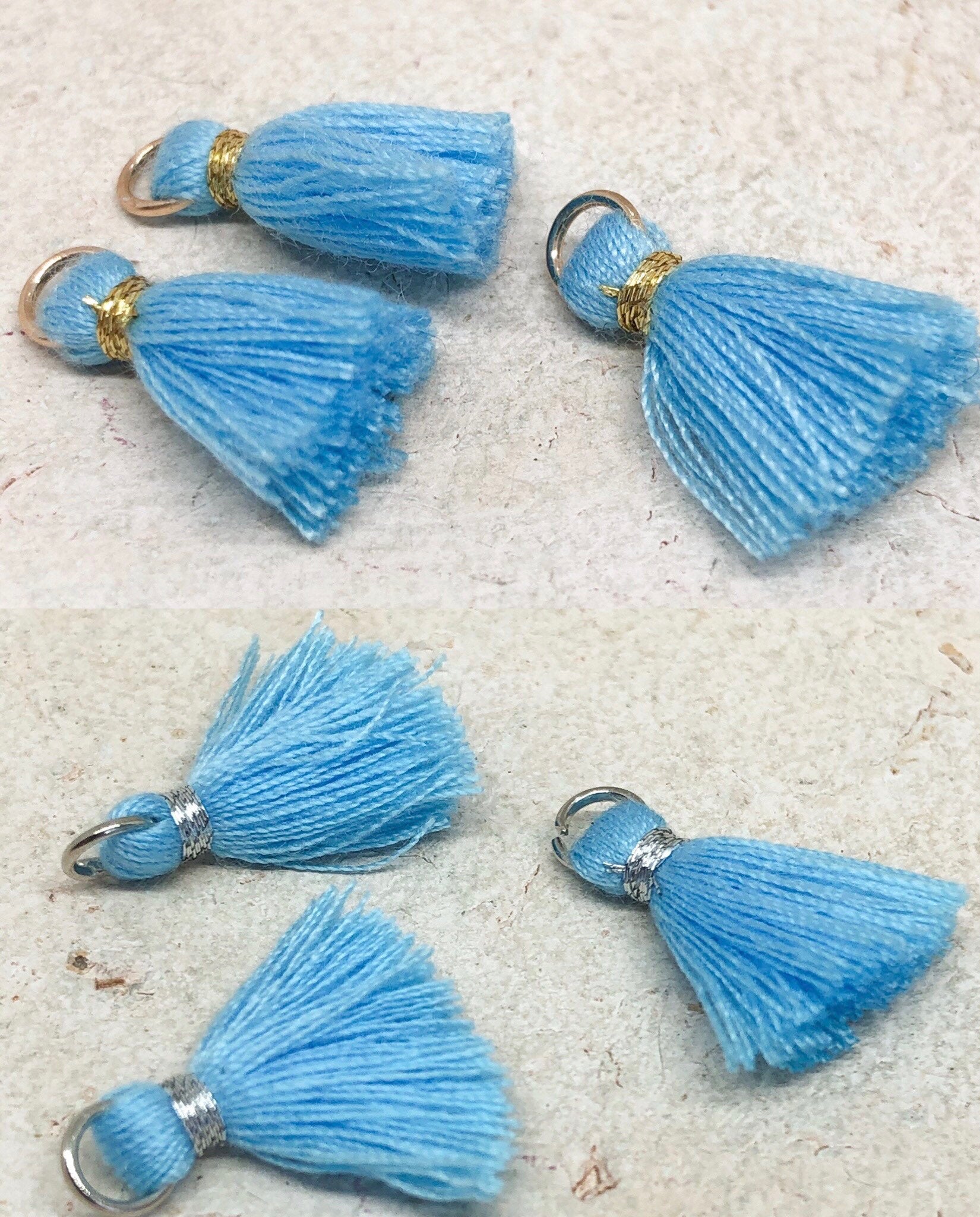 3 St. kleine Quasten, Hellblau - gold oder Hellblau - Silber, mit Öse.