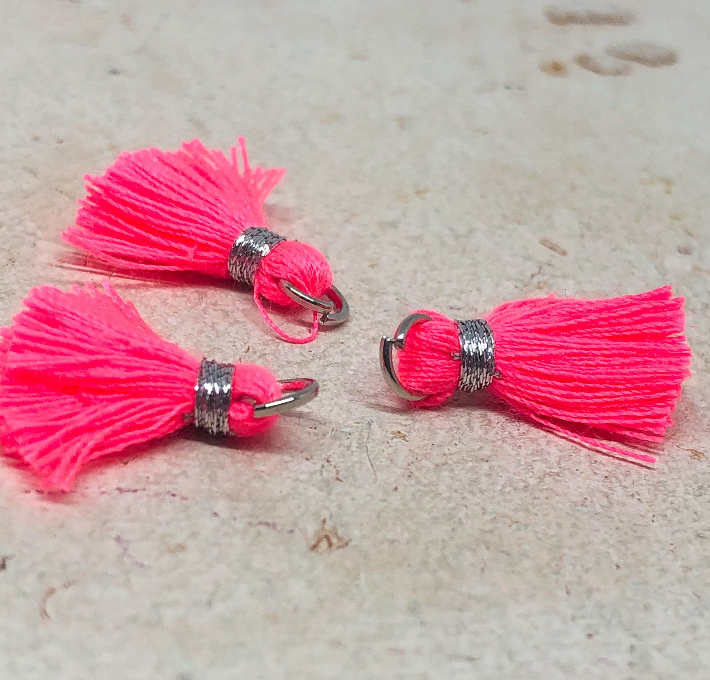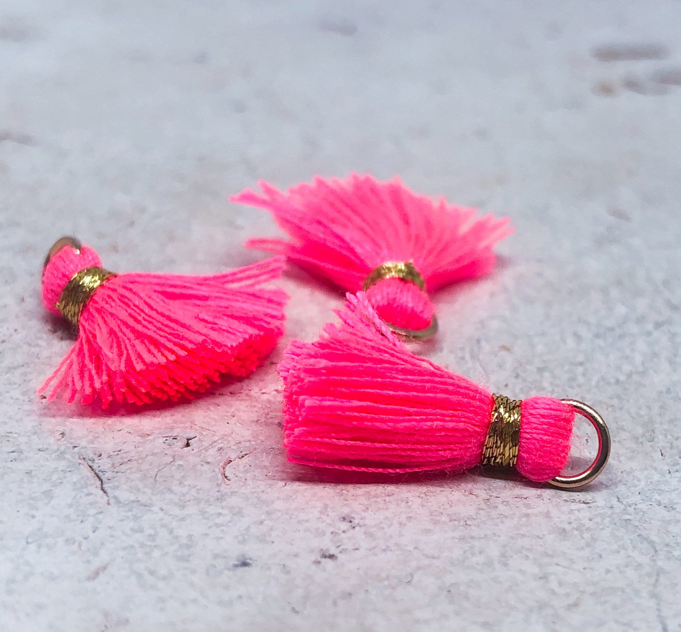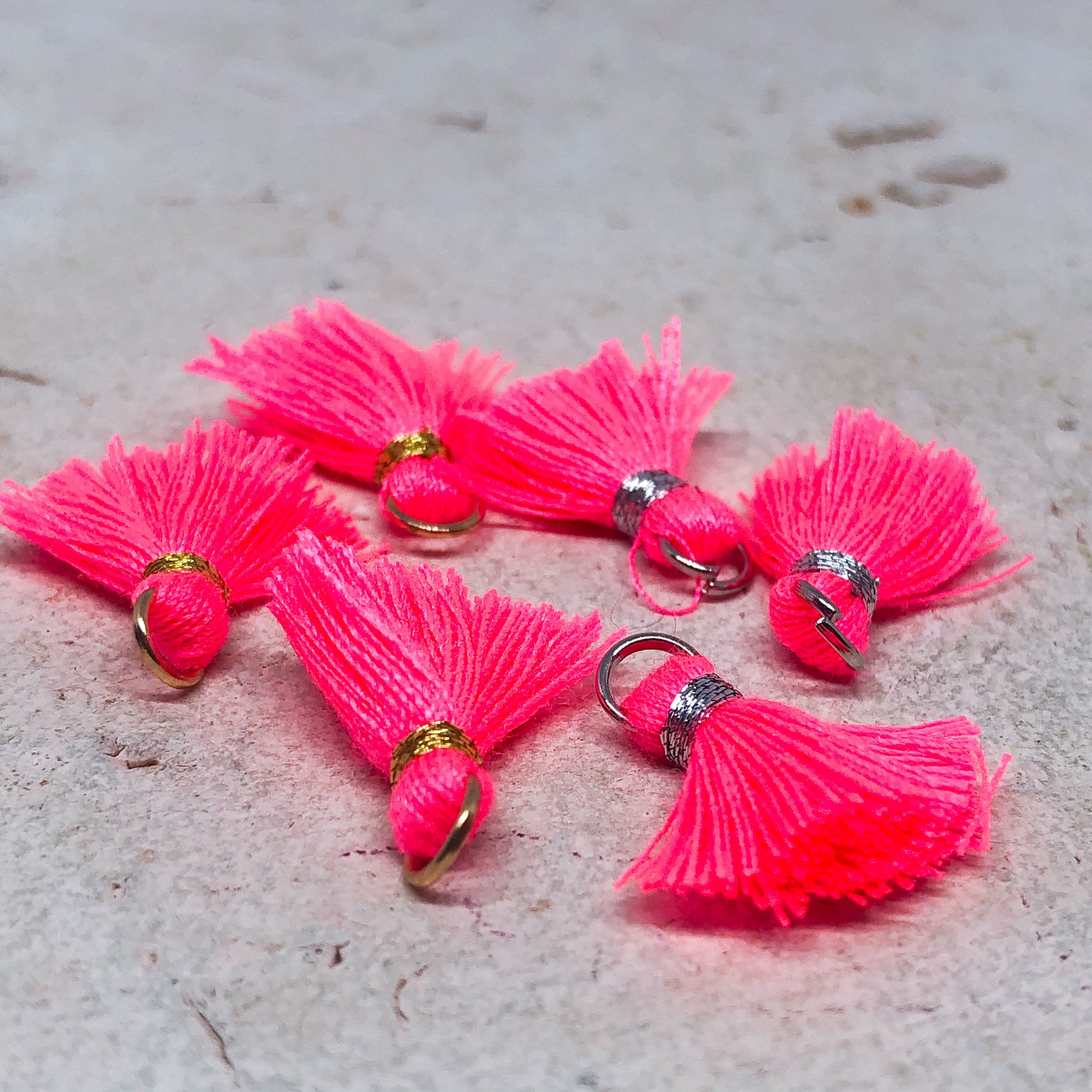 3 St. kleine Quasten, Neon Pink - Silber/Gold, mit Öse