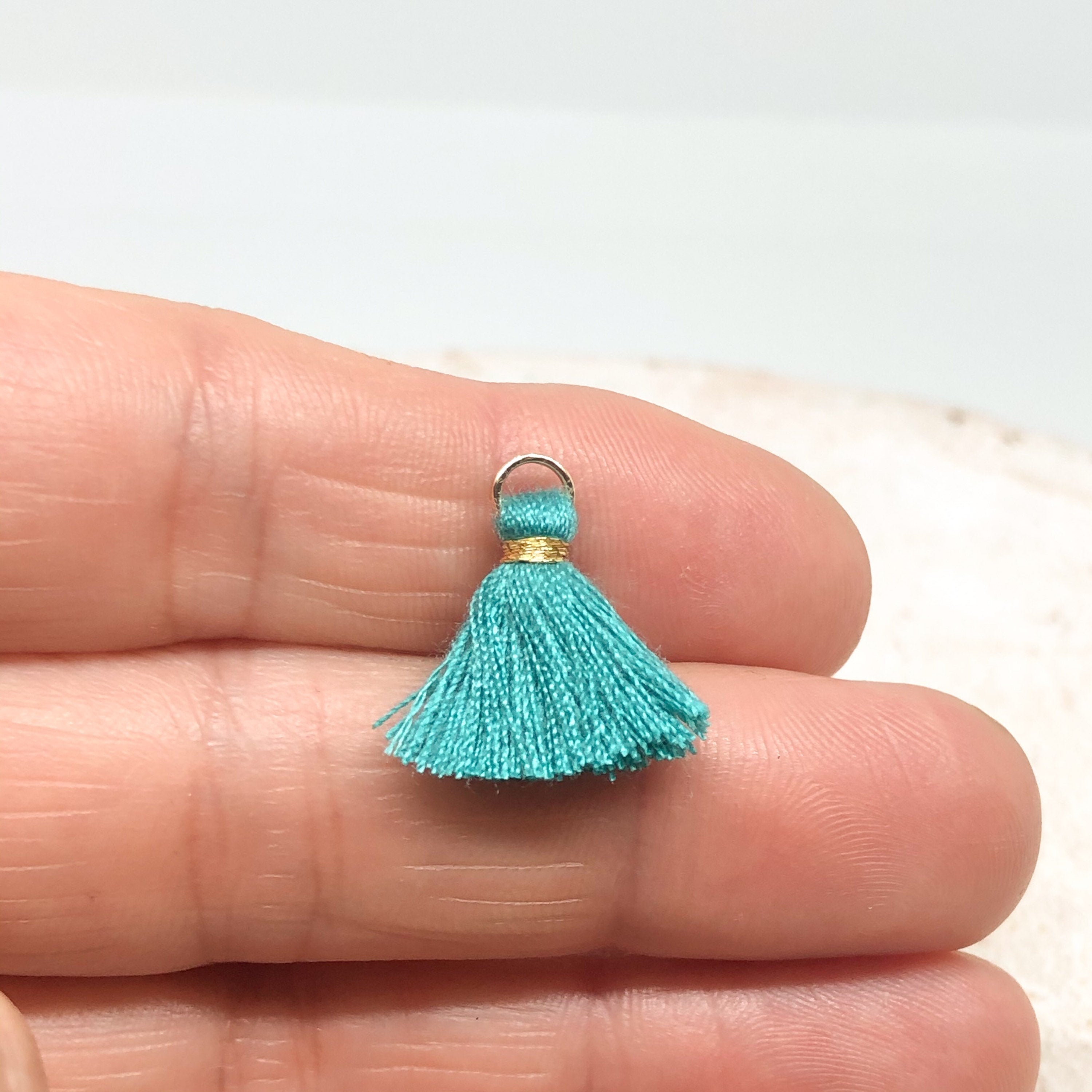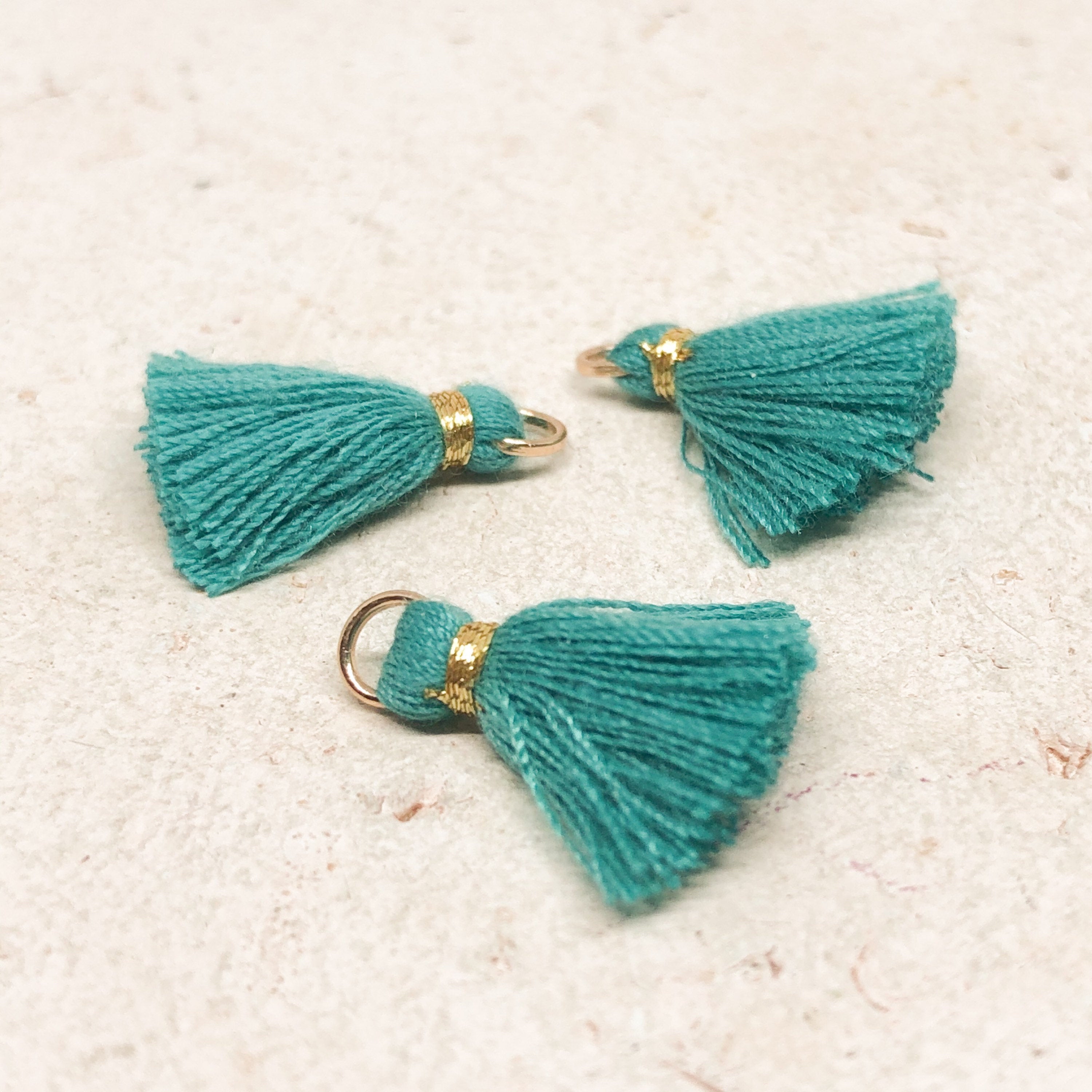 3 St. kleine Quasten, petrol - gold, mit Öse