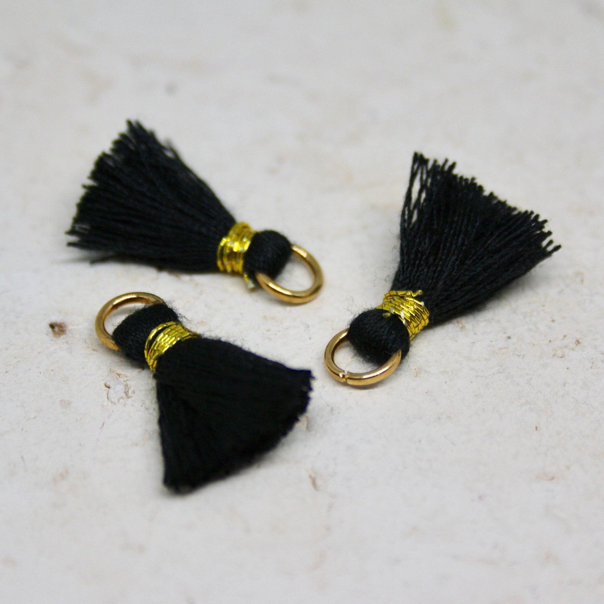 3 St. kleine Quasten, Schwarz - gold, mit Öse