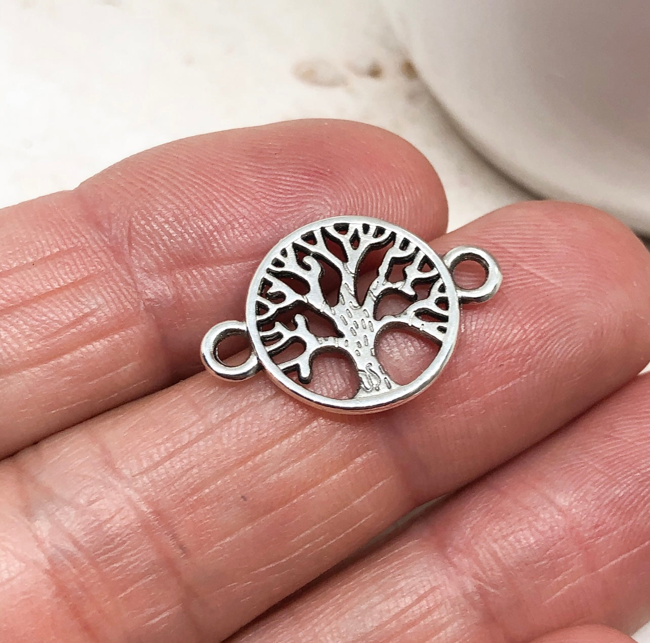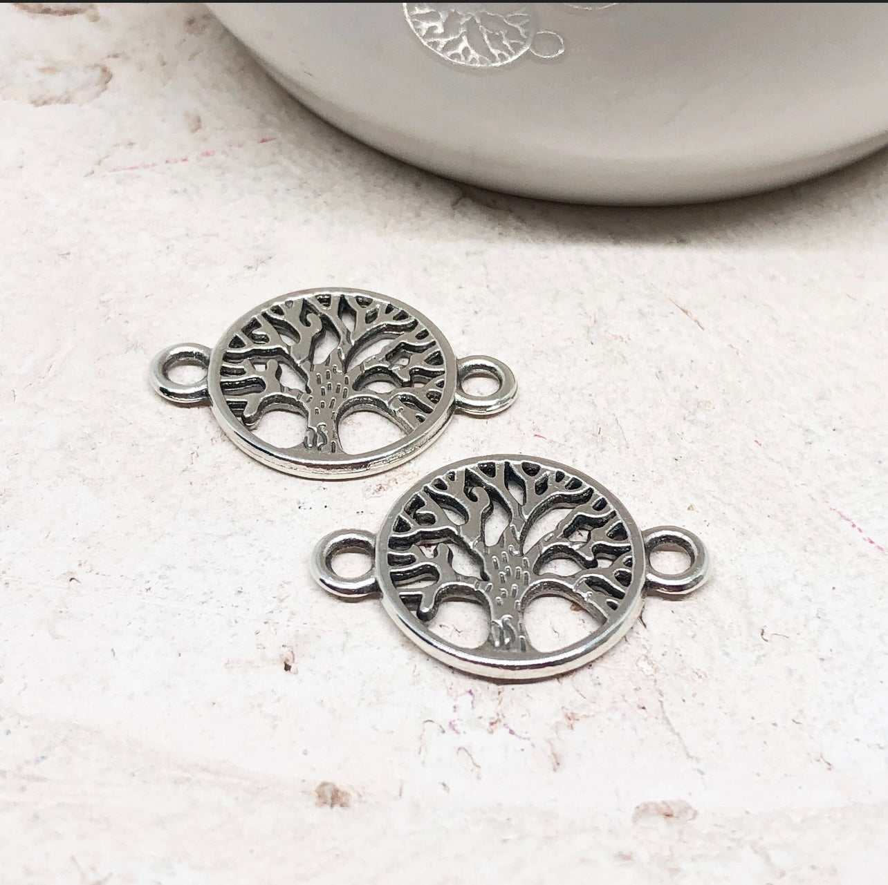 Hier handelt es sich um Verbinder- Lebensbaum- DQ Metall Bestens geeignet für Macraméarmbänder Menge: 2 St. Größe: 2cm lang- mit Öse - 1,6cm breit Farbe: Antik- Silber Material: Metall