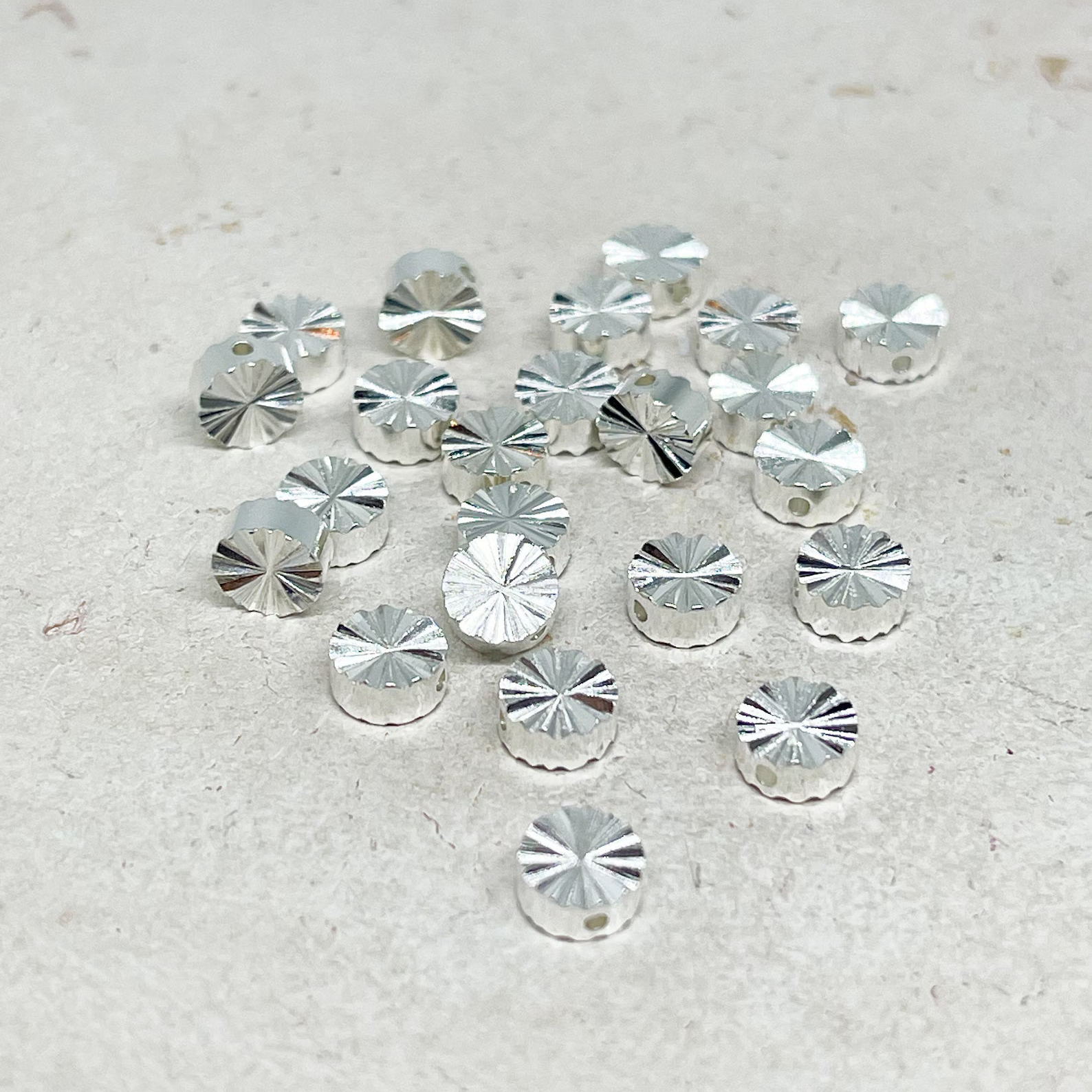 Kleine runde Perlen aus versilbertem Messing. Bestens geeignet für Armbänder; zwischen den Perlen als Abstandshalter oder um eine andere Perle zu betonen.