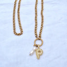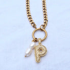 Der personalisierbare Initialen-Anhänger aus 18 K vergoldetem Messing ist mit Zirkonia-Steinen besetzt und sorgt für einen eleganten Blickfang. Ergänzt wird das Design durch zwei zarte Süßwasserperlen, die der Kette eine feminine Leichtigkeit verleihen.